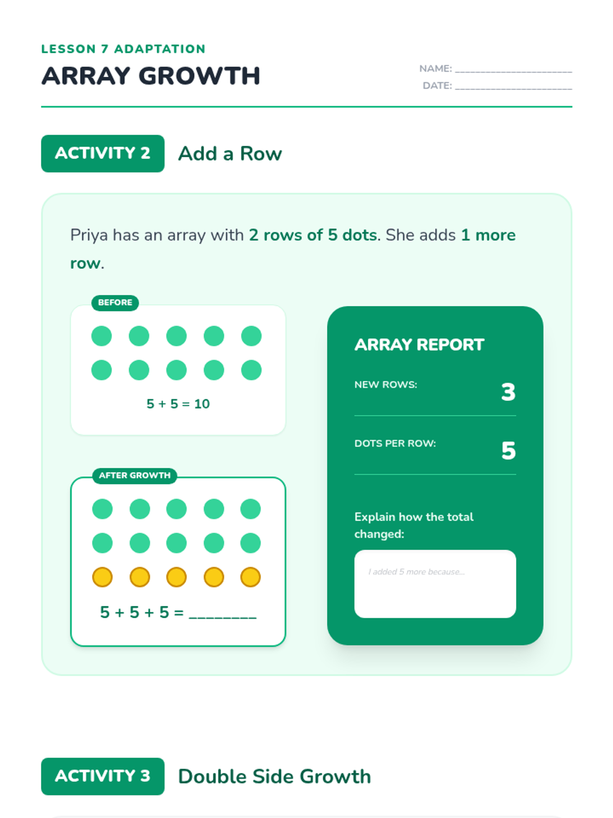 Revised Lesson 7 adaptation with corrected page breaks, improved text contrast for the Array Report section, and white backgrounds for explanation boxes to ensure handwriting remains legible.
