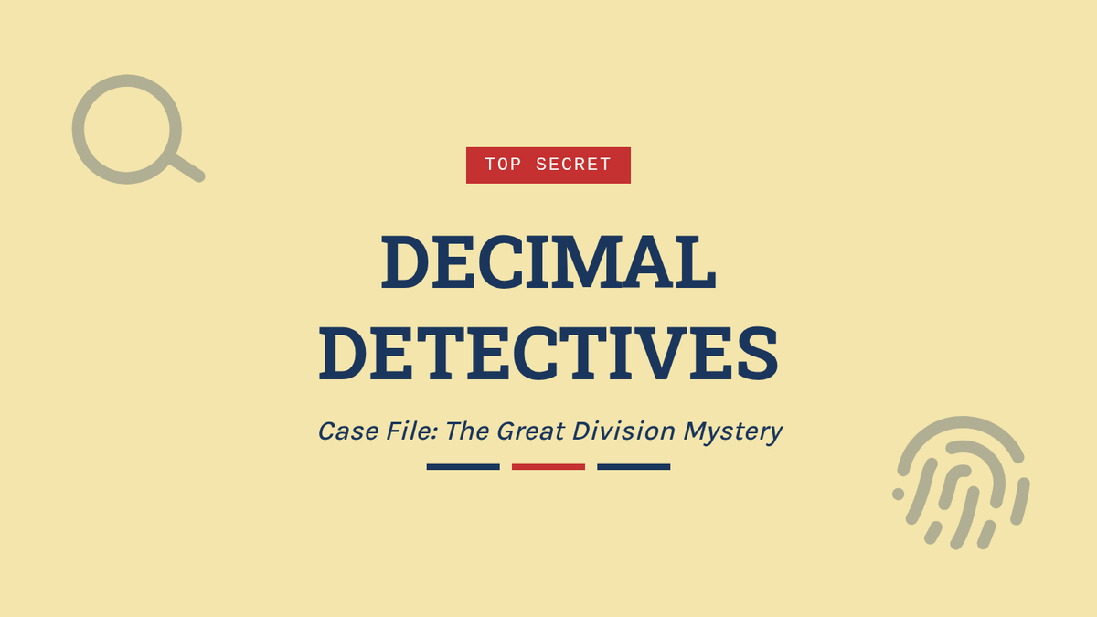 A visually engaging slide deck titled 'Decimal Detectives' that teaches decimal division using base-ten blocks and area models with a detective-noir theme.