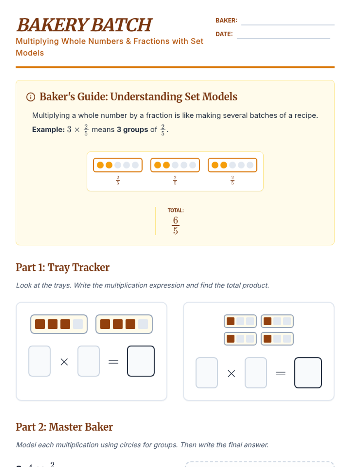 A bakery-themed independent practice worksheet for multiplying whole numbers and fractions using set models. It features visual tray problems, drawing spaces for modeling, and real-world word problems.