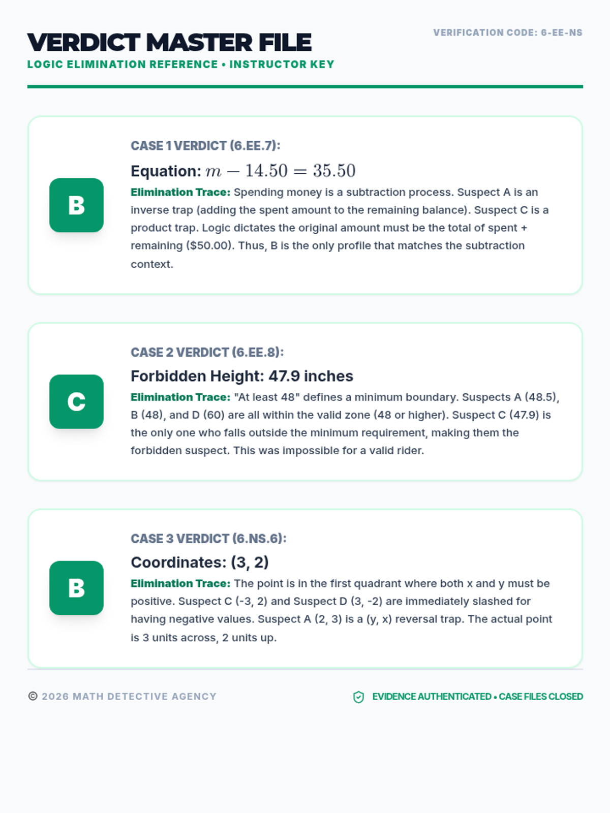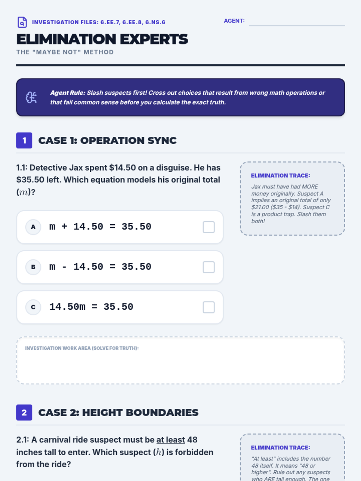 A detective-themed multiple-choice worksheet focusing on standard 6.EE.7, 6.EE.8, and 6.NS.6. Students use the process of elimination to solve one-step equations, identify valid height constraints, and map points in the first quadrant of a coordinate plane.