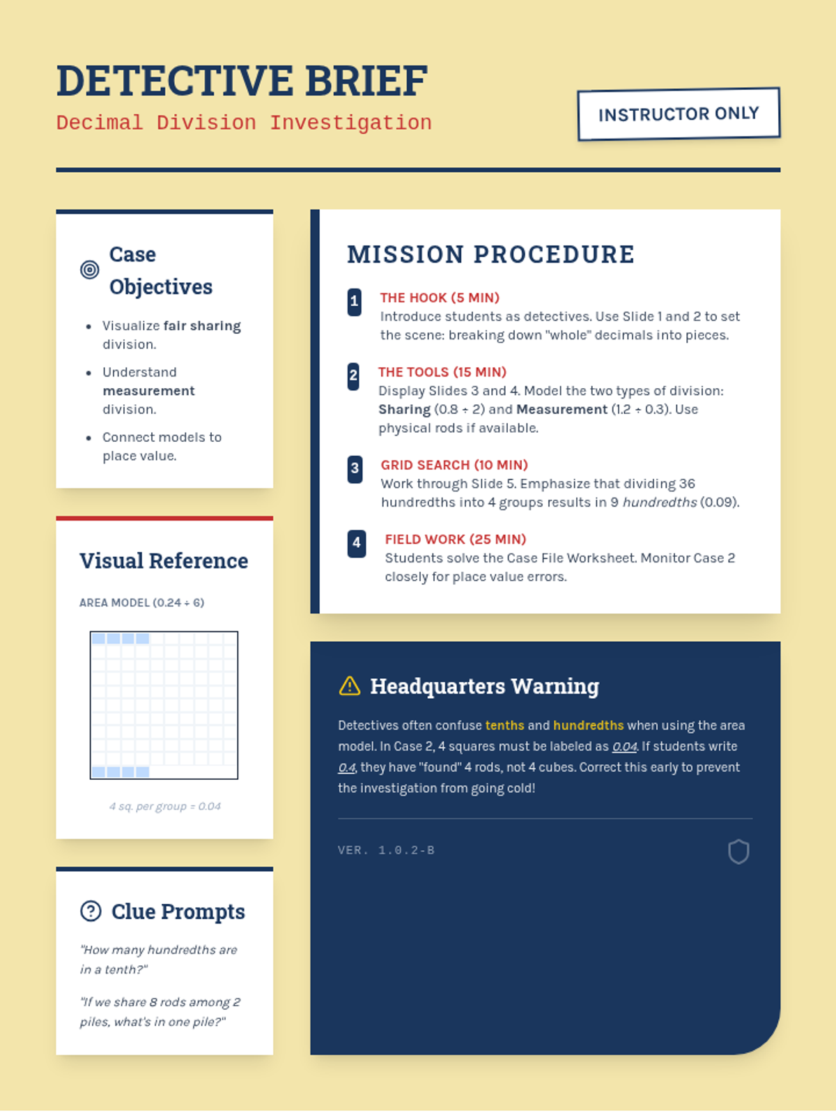 A detective-themed teacher guide for the Decimal Detectives lesson, including learning objectives, a lesson procedure, and strategic questioning prompts.