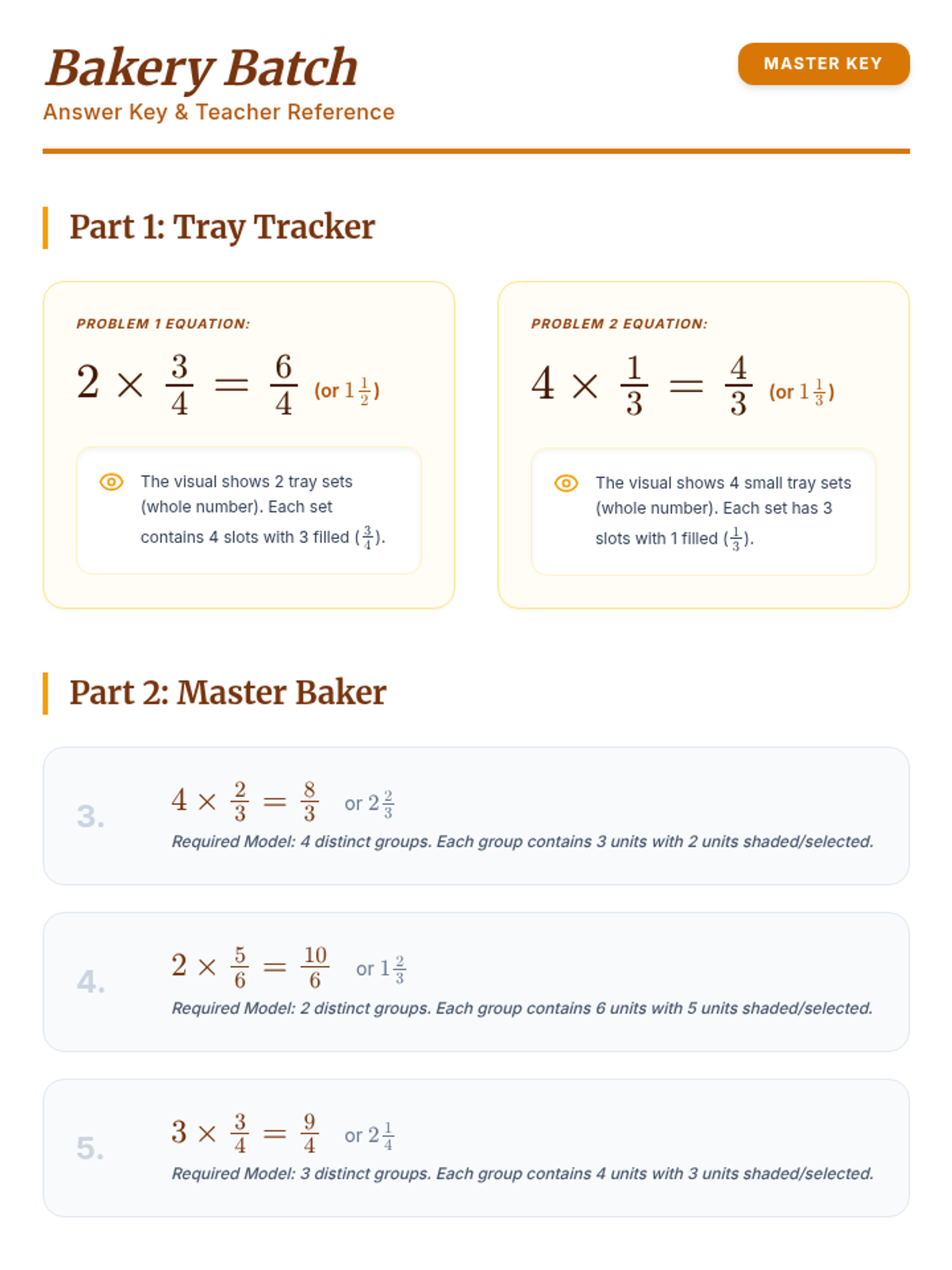 Answer key for the Bakery Batch Worksheet, providing correct equations, products (both improper fractions and mixed numbers), and teaching strategies for explaining set models.