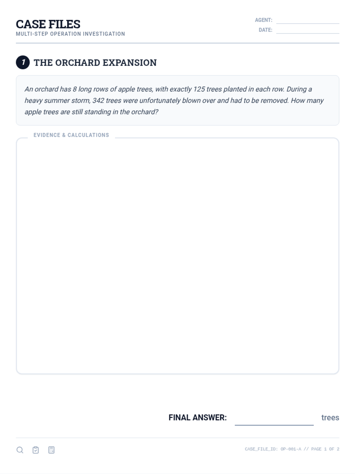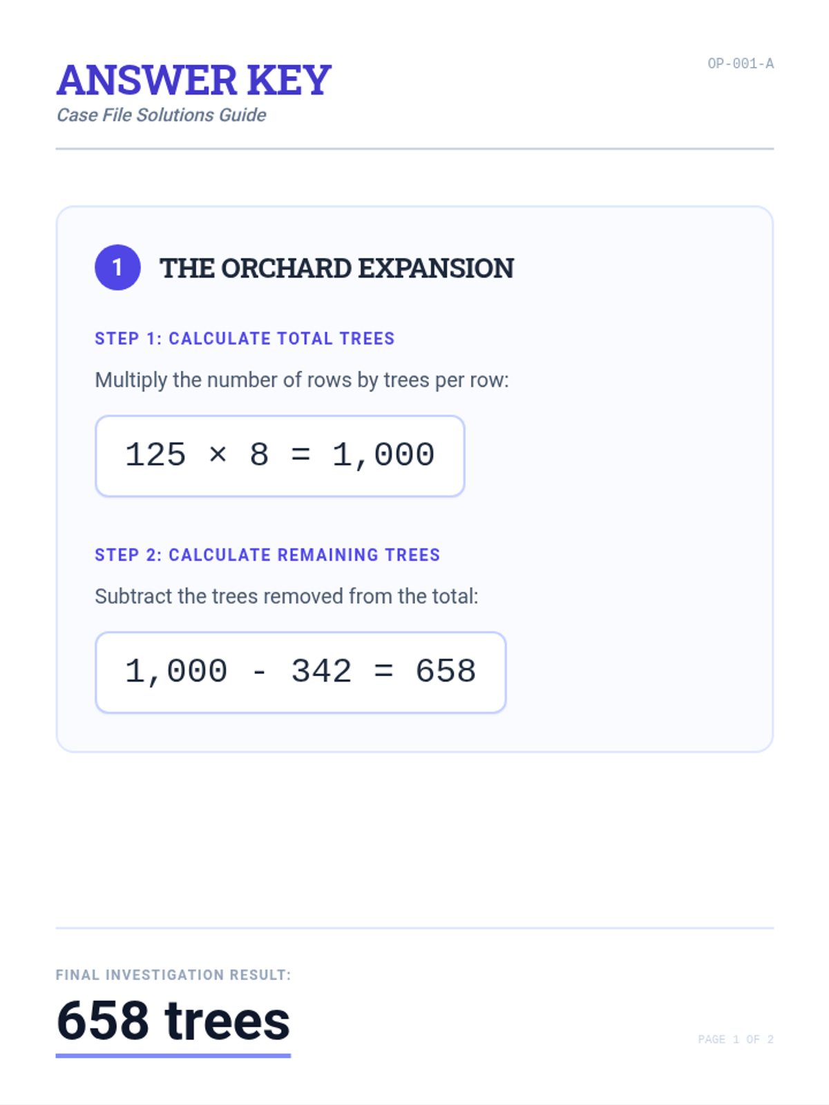 A detailed teacher answer key for the Case Files Worksheet, providing step-by-step solutions and final answers for each multi-step word problem. Revised for layout consistency and contrast.
