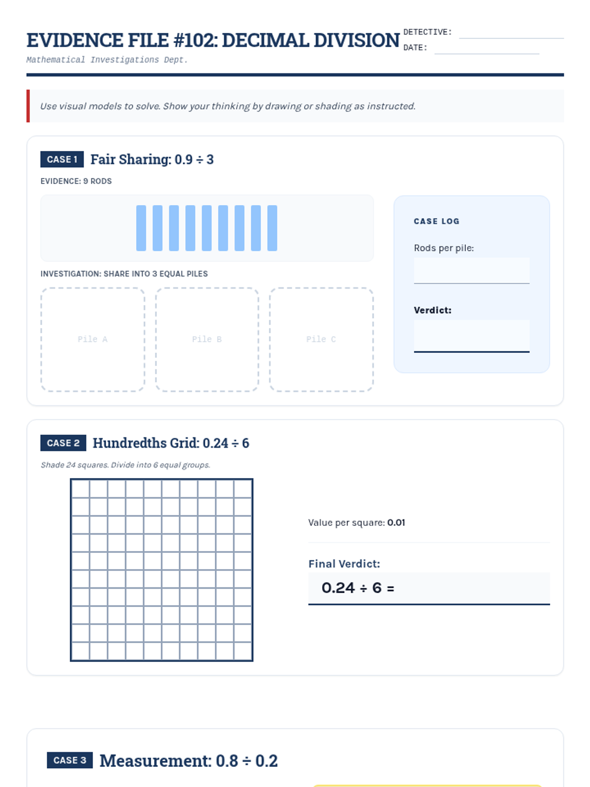 A student worksheet titled 'Evidence File #102' where students solve decimal division problems using base-ten rods and hundredths grids in a detective-themed layout.