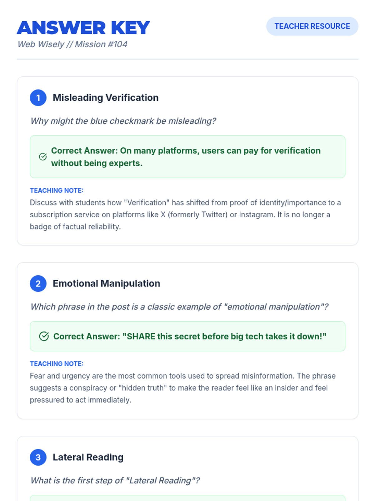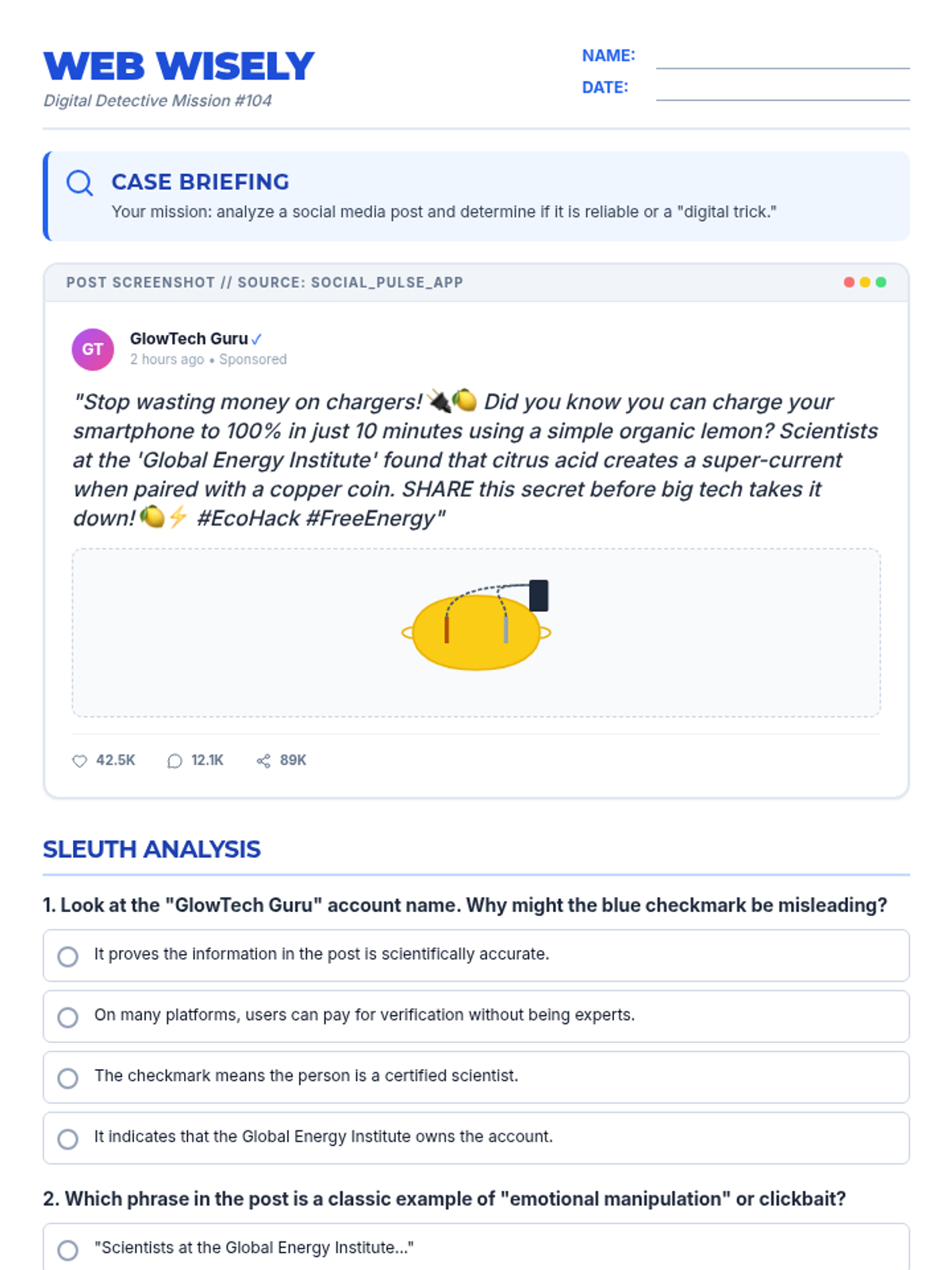 A digital literacy worksheet where students analyze a fictional viral social media post to identify misinformation, red flags, and practice lateral reading skills.