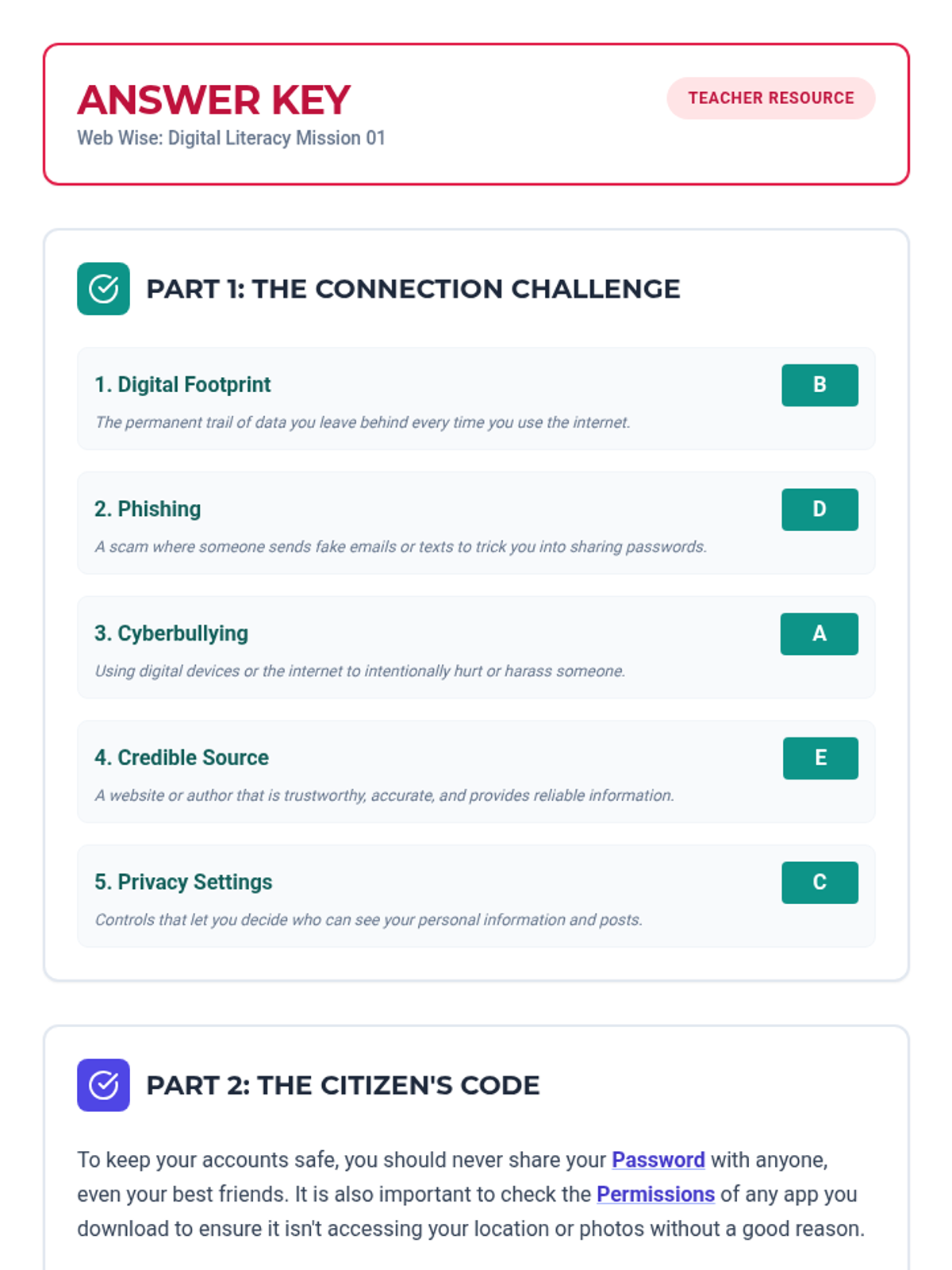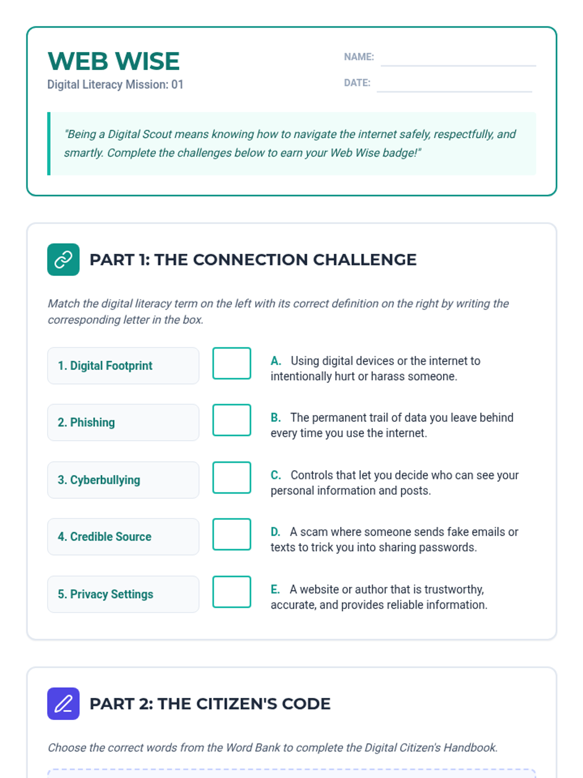 A worksheet for students to practice digital literacy concepts, featuring a matching section for key terms and a fill-in-the-blank passage about digital citizenship. Revised for improved alphabetical order and baseline alignment.