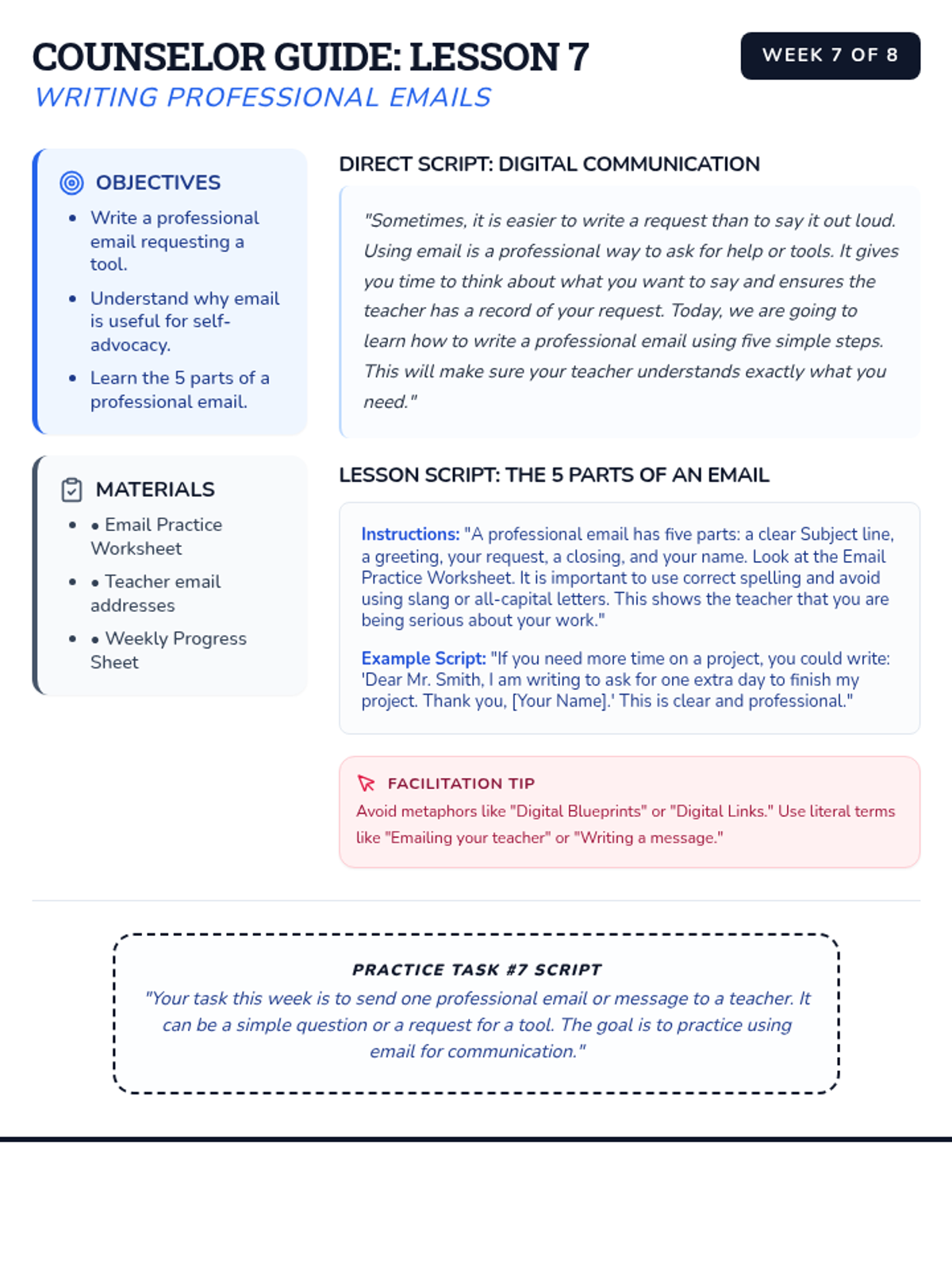 Expanded counselor guide for Week 7 with more detailed word-for-word scripts and instructional notes. Reverted to the original blue blueprint theme. Removed all IEP/Goal terminology.