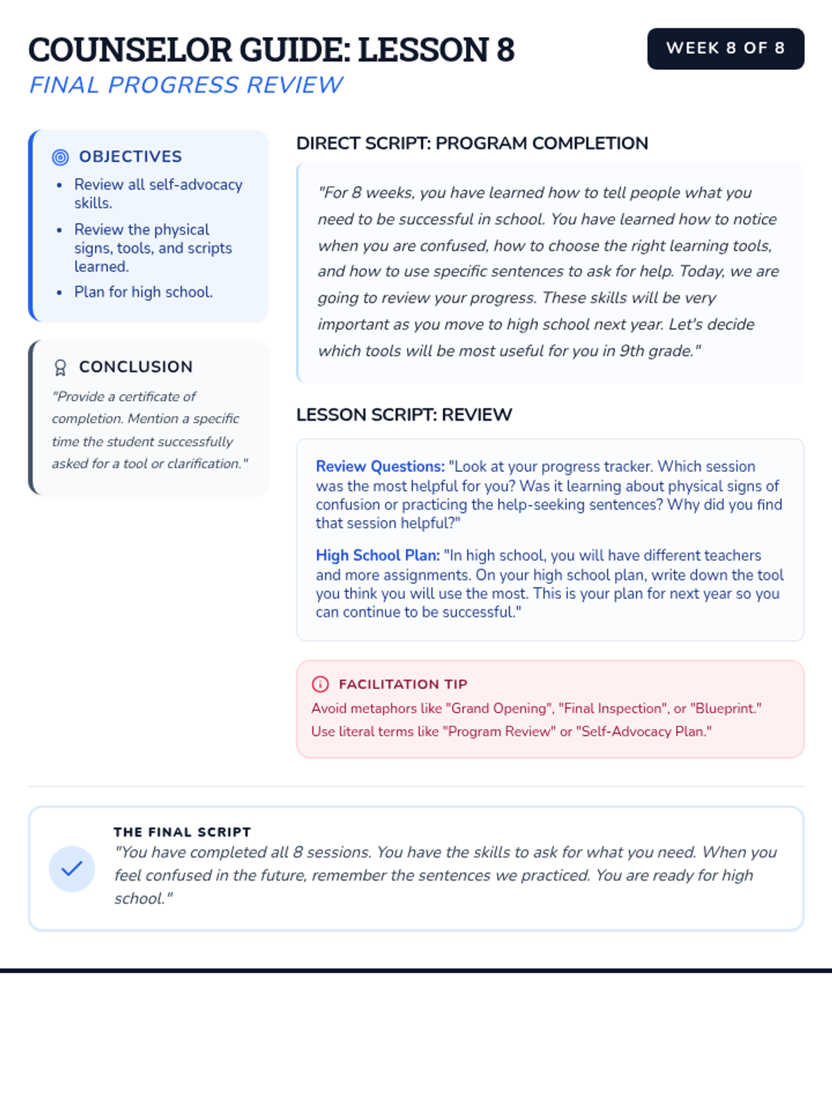 Expanded counselor guide for Week 8 with more detailed word-for-word scripts and instructional notes. Reverted to the original blue blueprint theme. Removed all IEP/Goal terminology.
