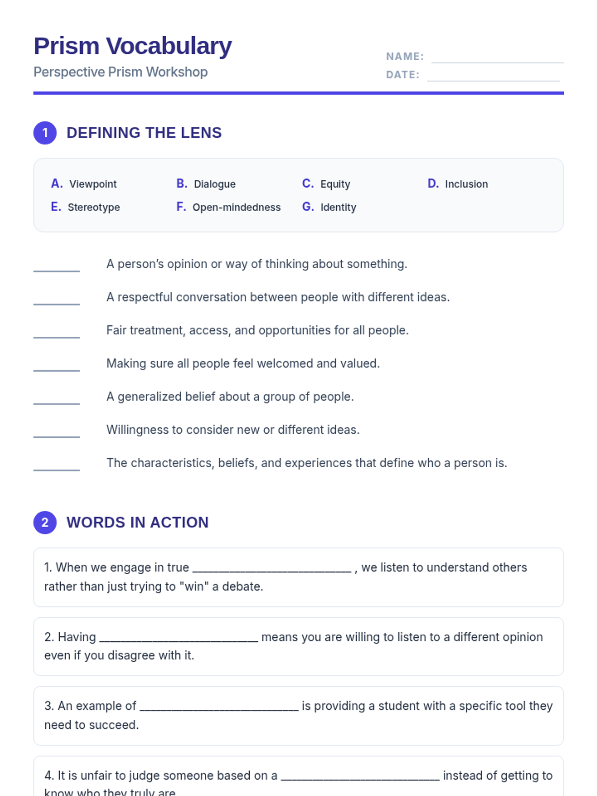 An updated vocabulary worksheet for students to define and apply key terms like identity, equity, inclusion, and open-mindedness. Now consolidated into a clear two-page layout with improved spacing and longer answer lines.