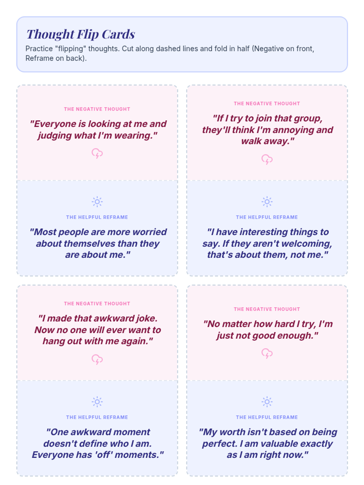 A set of printable flashcards featuring common social anxiety thoughts and their balanced reframes, now expanded to include self-worth specific examples like 'I am not good enough' and 'I wish I was smarter'.