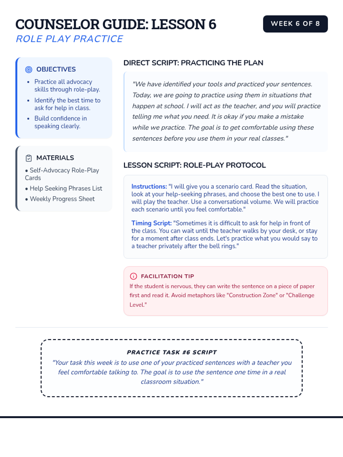 Expanded counselor guide for Week 6 with more detailed word-for-word scripts and instructional notes. Reverted to the original blue blueprint theme. Removed all IEP/Goal terminology.