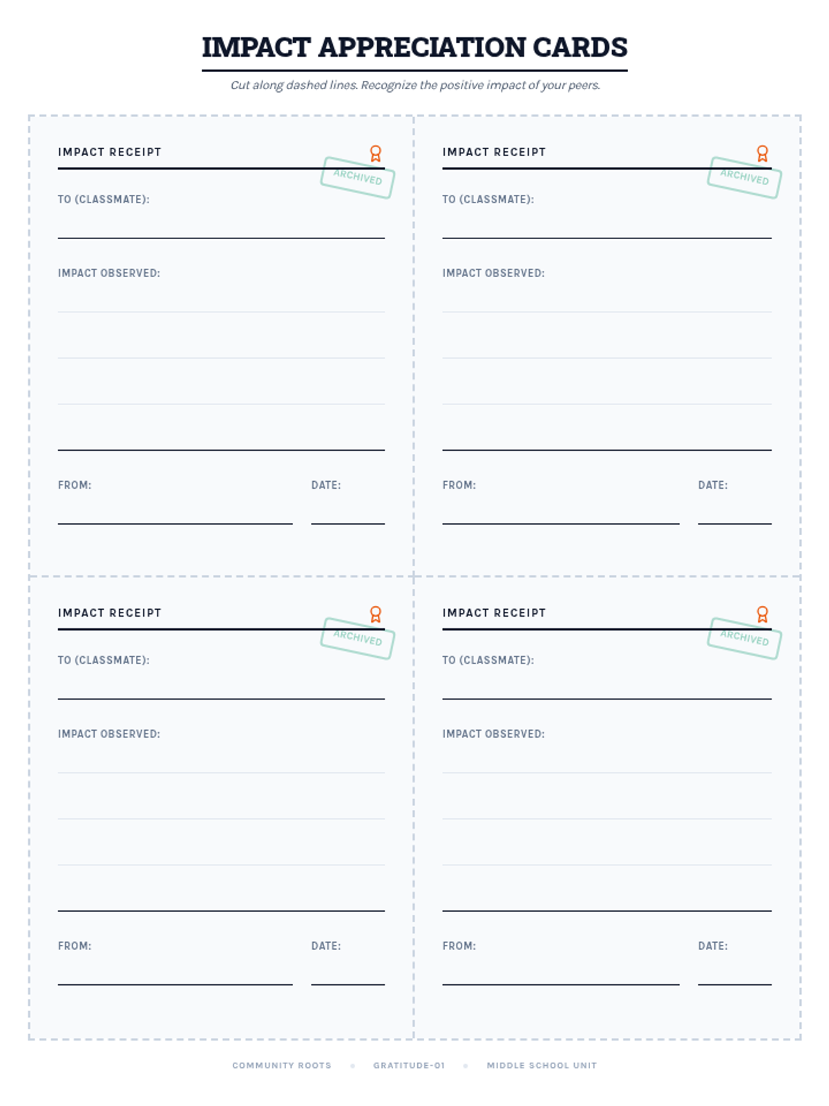 Printable "Impact Receipts" for students to give each other, recognizing peer contributions to the school community.