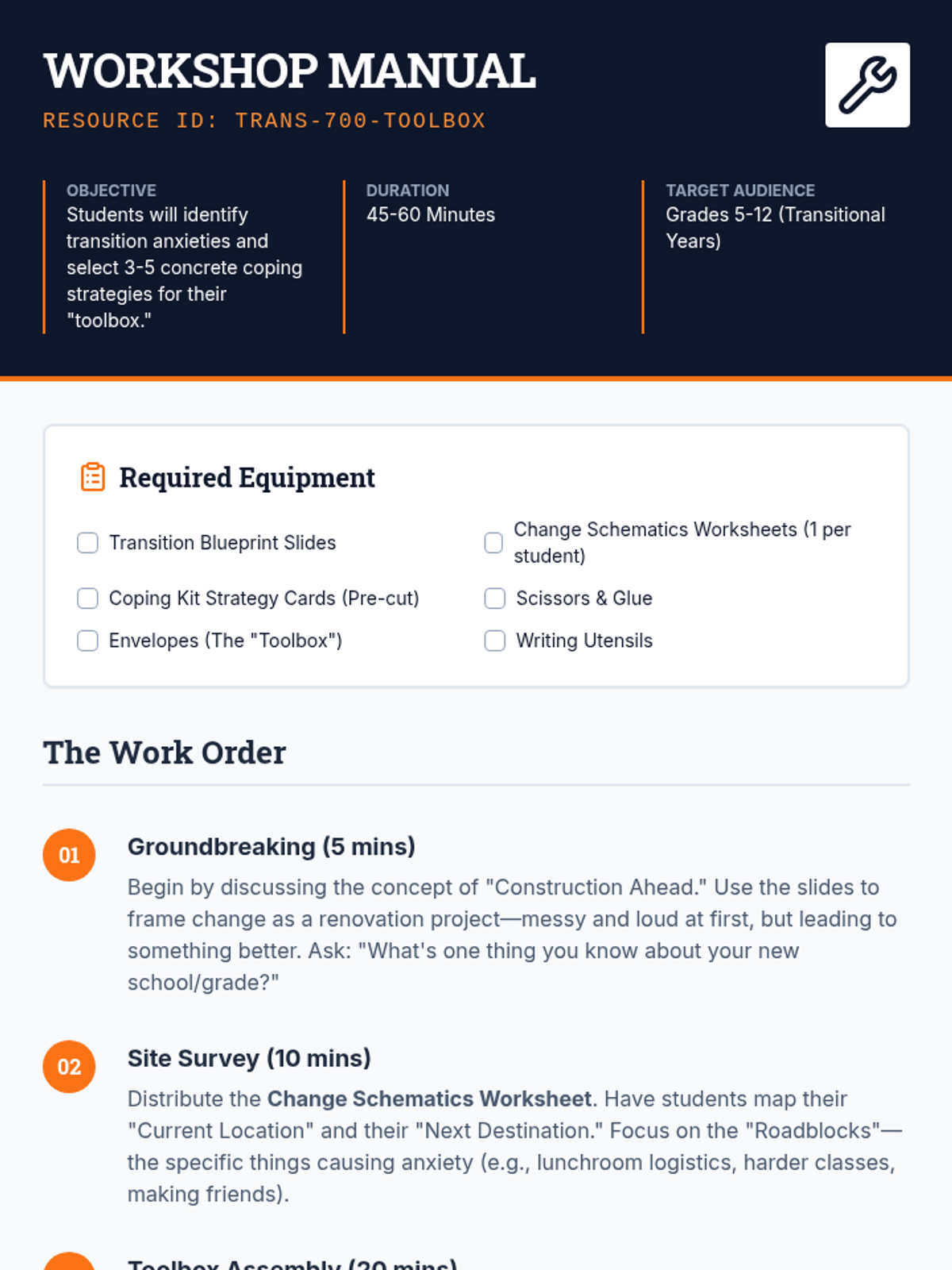 A comprehensive teacher's guide for "The Transition Toolbox" intervention. Includes lesson objectives, materials checklists, a step-by-step procedure (The Work Order), and differentiation strategies.