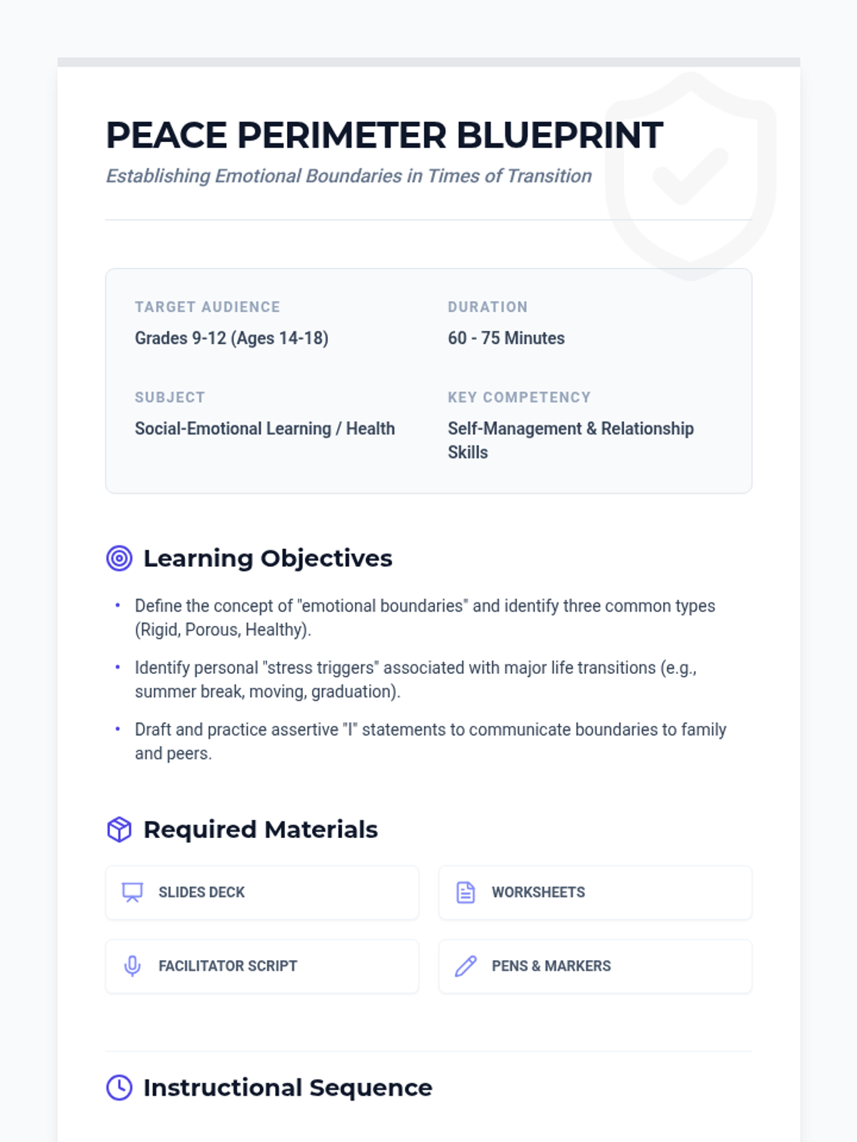 A detailed lesson plan for a high school workshop on emotional boundaries, including objectives, materials, and a step-by-step instructional sequence for helping students manage stressful transitions.
