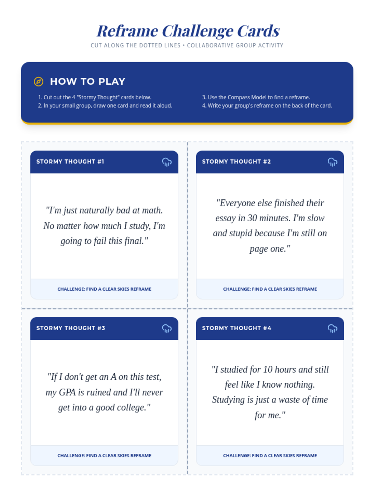 Printable activity cards for reframing. Revised to include the instructions on a single page, improved icon coloring, better contrast for text, and a dedicated back-page design for student responses. Revised for correct duplex printing alignment.