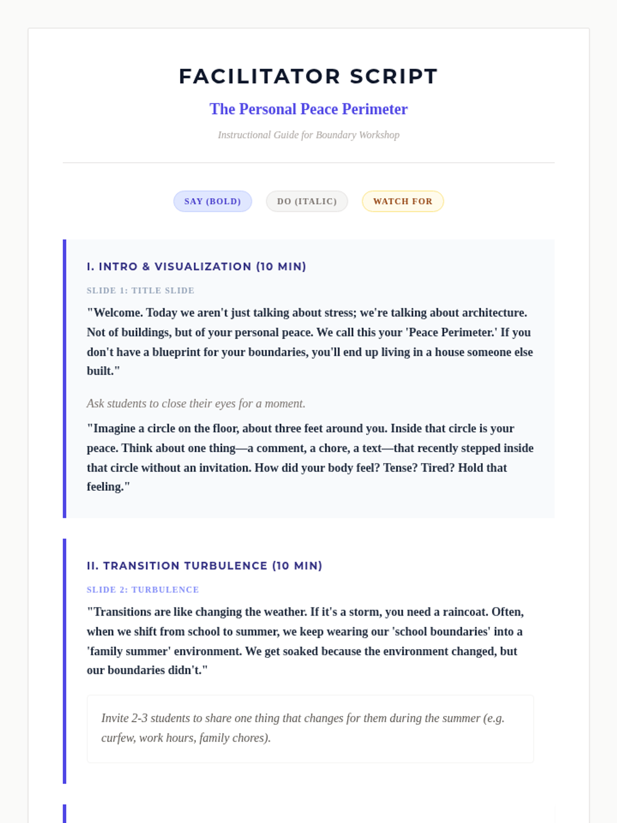 A comprehensive facilitation script for teachers leading the Peace Perimeter workshop. It provides word-for-word prompts, slide cues, and pedagogical notes to ensure a smooth and impactful delivery.