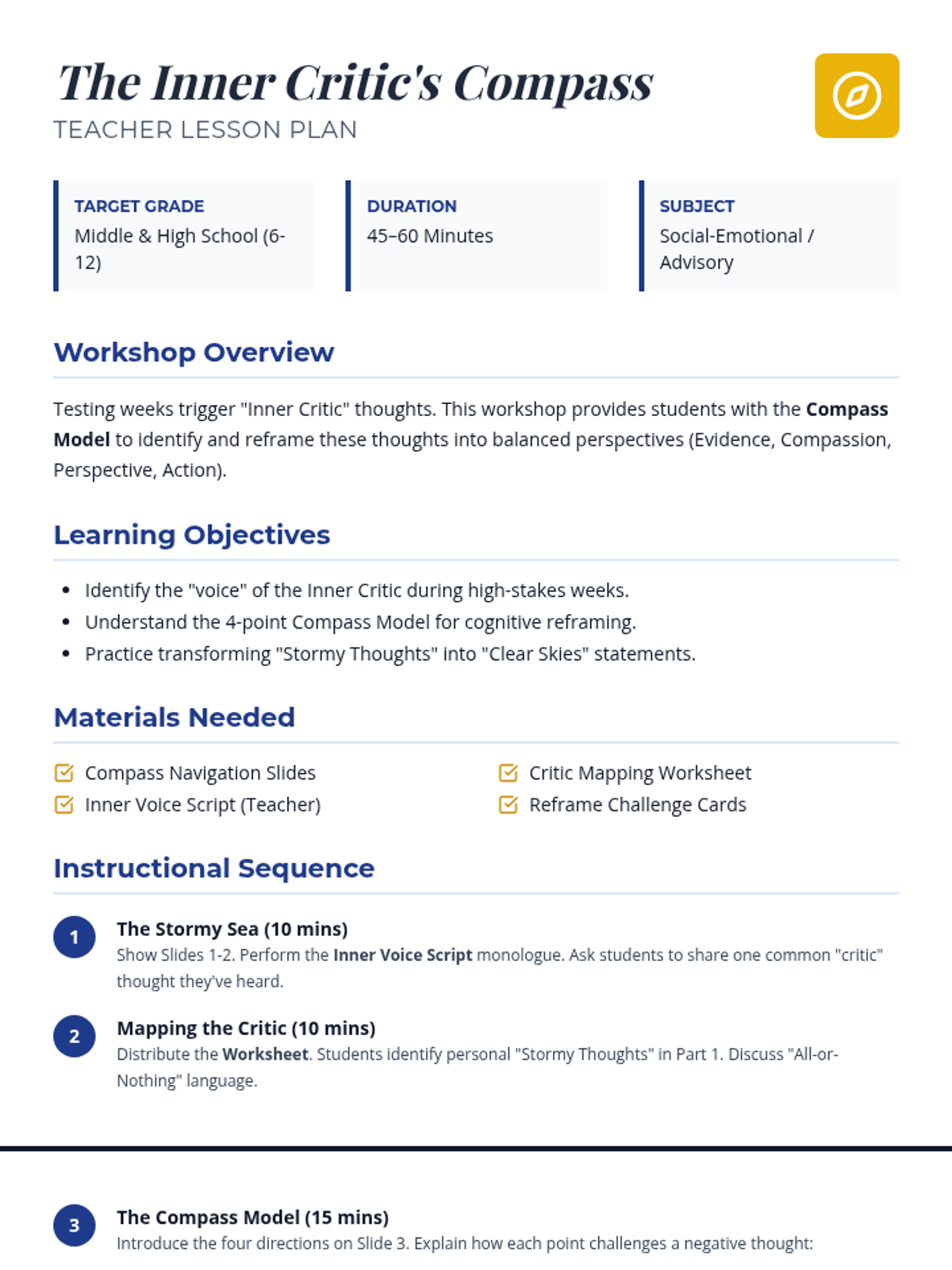 A comprehensive teacher lesson plan for 'The Inner Critic's Compass' workshop, featuring learning objectives, a detailed 5-step instructional sequence, and differentiation strategies for middle and high school settings. Revised to optimize page flow and condensing content.