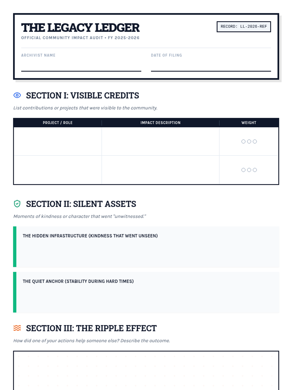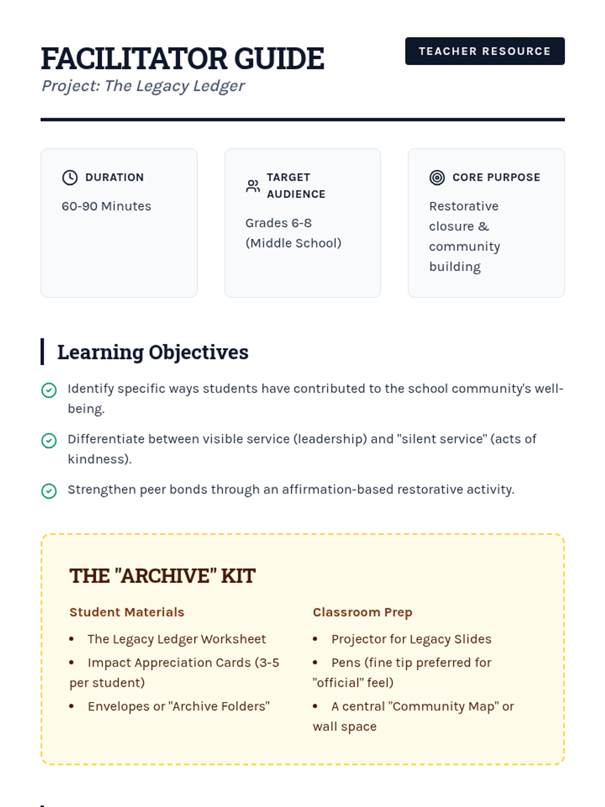 A comprehensive facilitation guide for the Legacy Ledger project, including restorative circle prompts, instructional steps, and differentiation strategies.