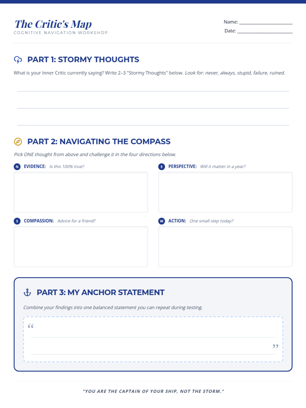 Student-facing worksheet for cognitive reframing. Revised to include larger student work areas, prompts moved outside boxes, an additional stormy thought line, and a cleaner Anchor Statement section with a light background. Reduced height to fit everything on a single page.