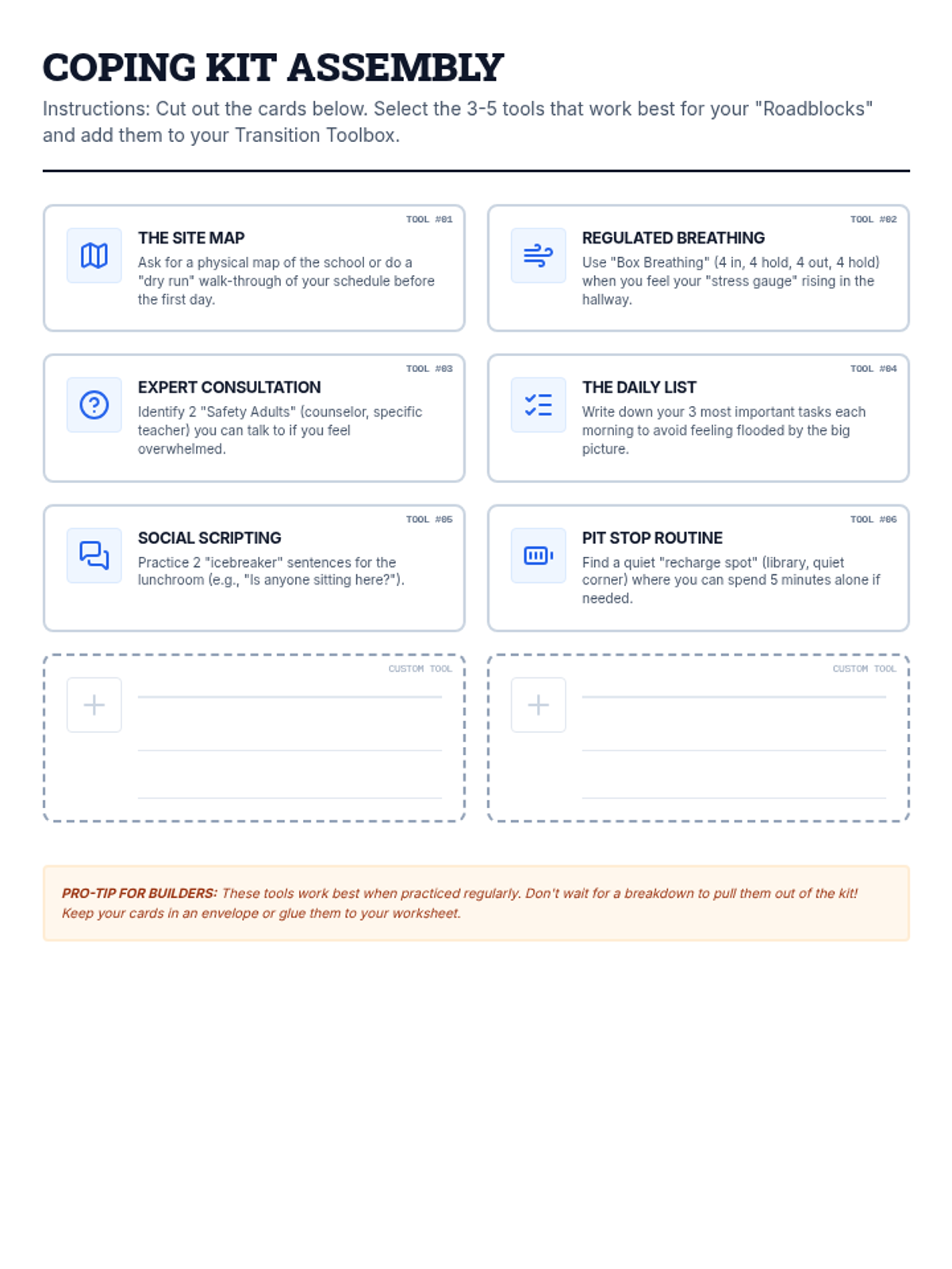A collection of printable coping strategy cards designed to be cut out and placed in a student's personalized "toolbox." Includes specific techniques like social scripting, regulated breathing, and logistics mapping.