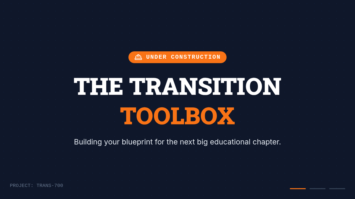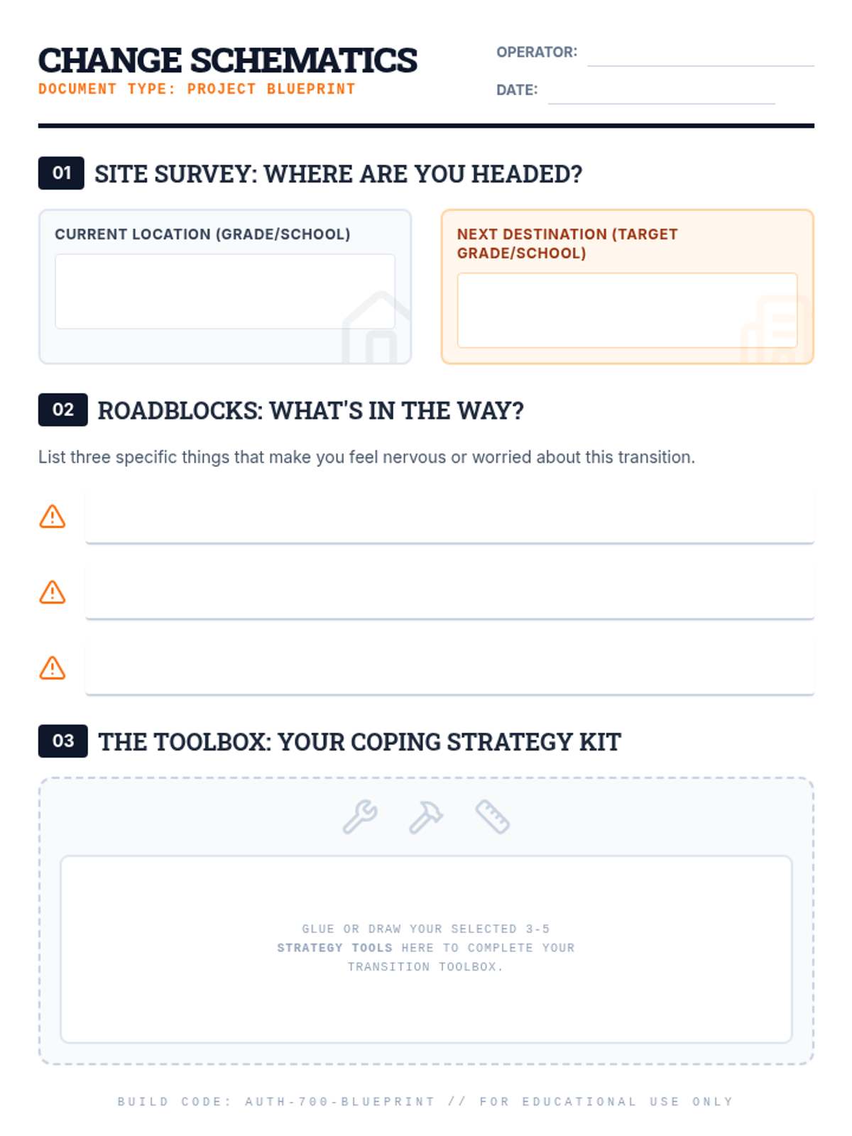 A visual presentation guiding students through the transition process. Uses a construction/blueprint theme to help students identify anxieties (roadblocks) and coping strategies (tools).