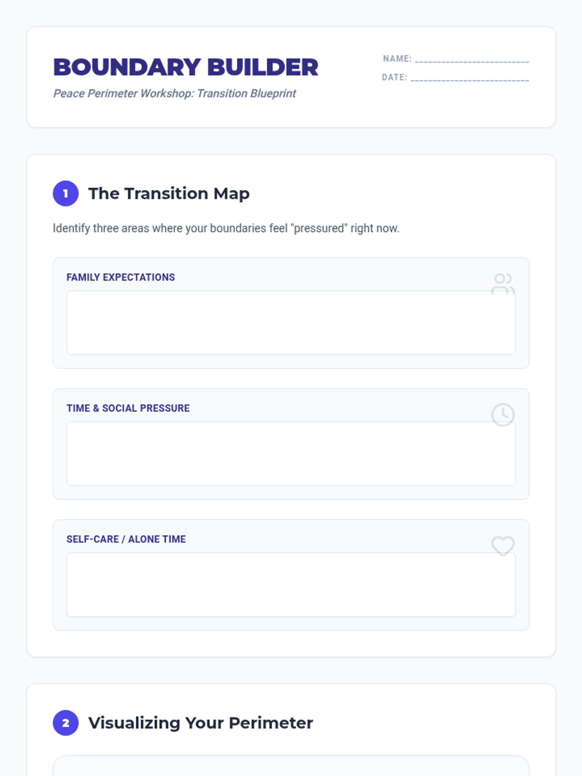 A structured student worksheet for the Peace Perimeter workshop. It includes a stress-mapping activity, a visual perimeter-drawing exercise, and space for students to draft their own assertive 'I' statements.