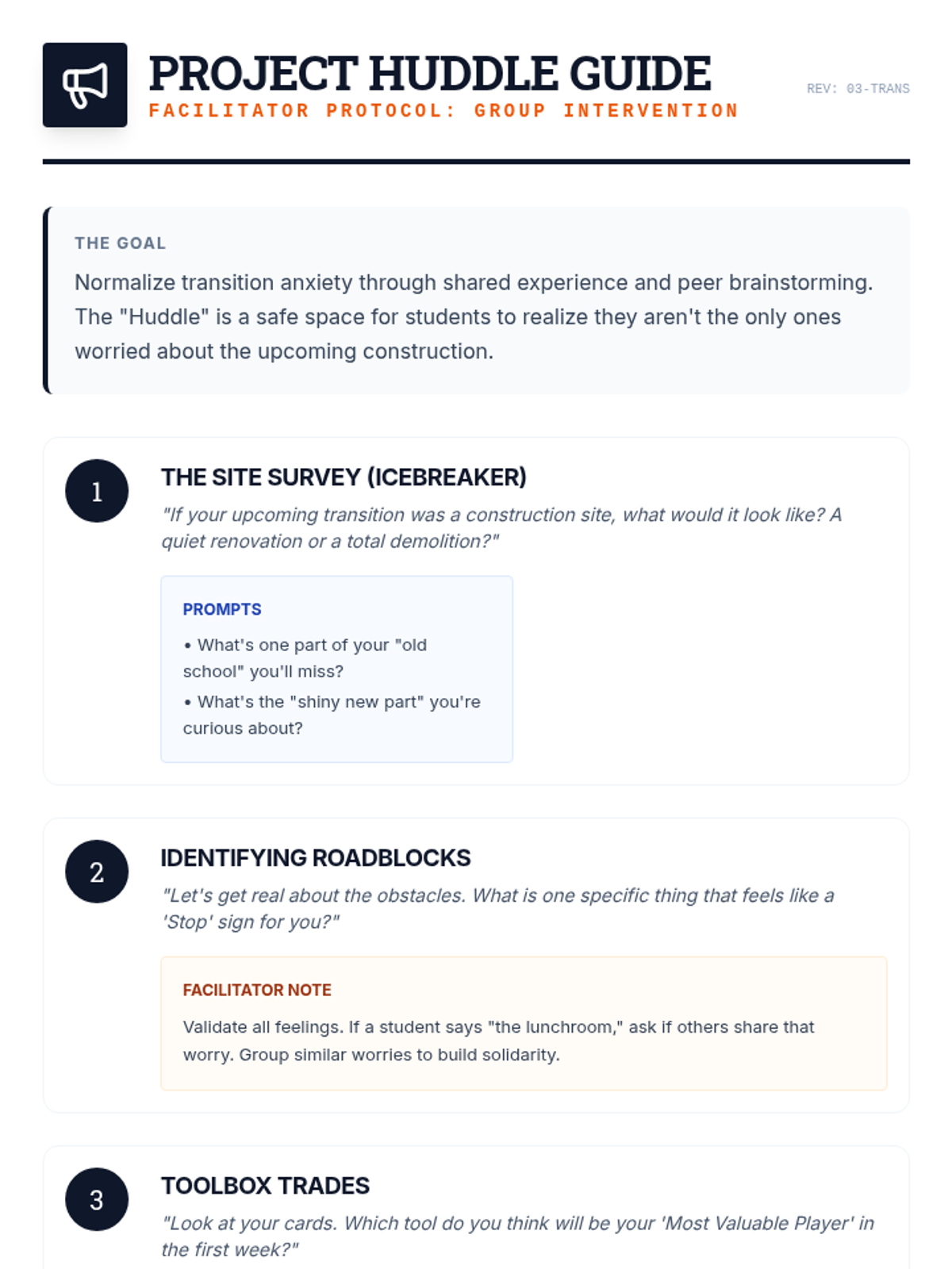A structured discussion guide for small group or whole-class conversation. Provides prompts for normalizing anxiety, sharing "roadblocks," and peer-mentoring through "toolbox trades."