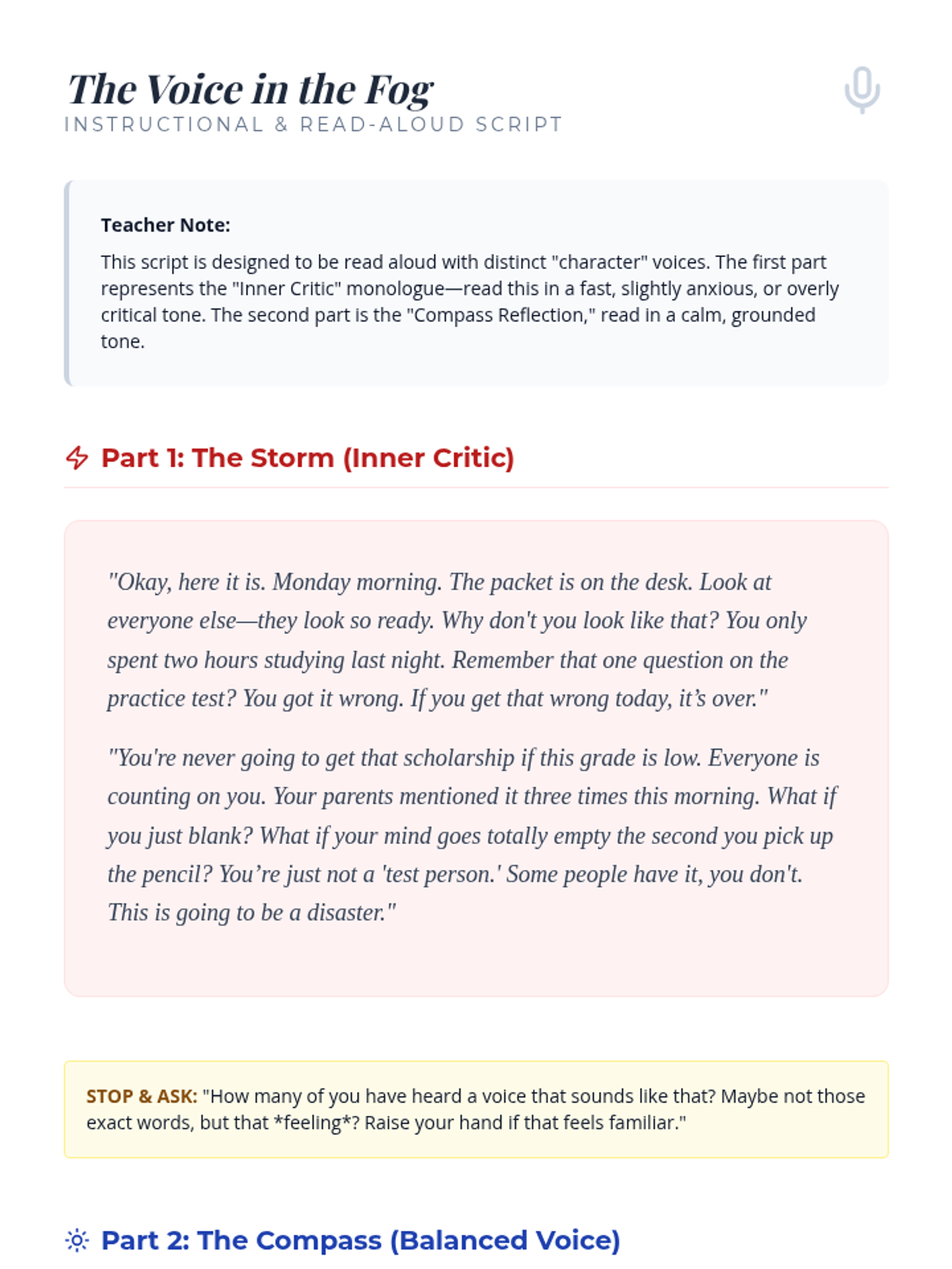 A teacher script for 'The Inner Critic's Compass' featuring a relatable 'Inner Critic' monologue and a step-by-step cognitive reframing guide. Designed to model the difference between negative self-talk and balanced navigation for students.