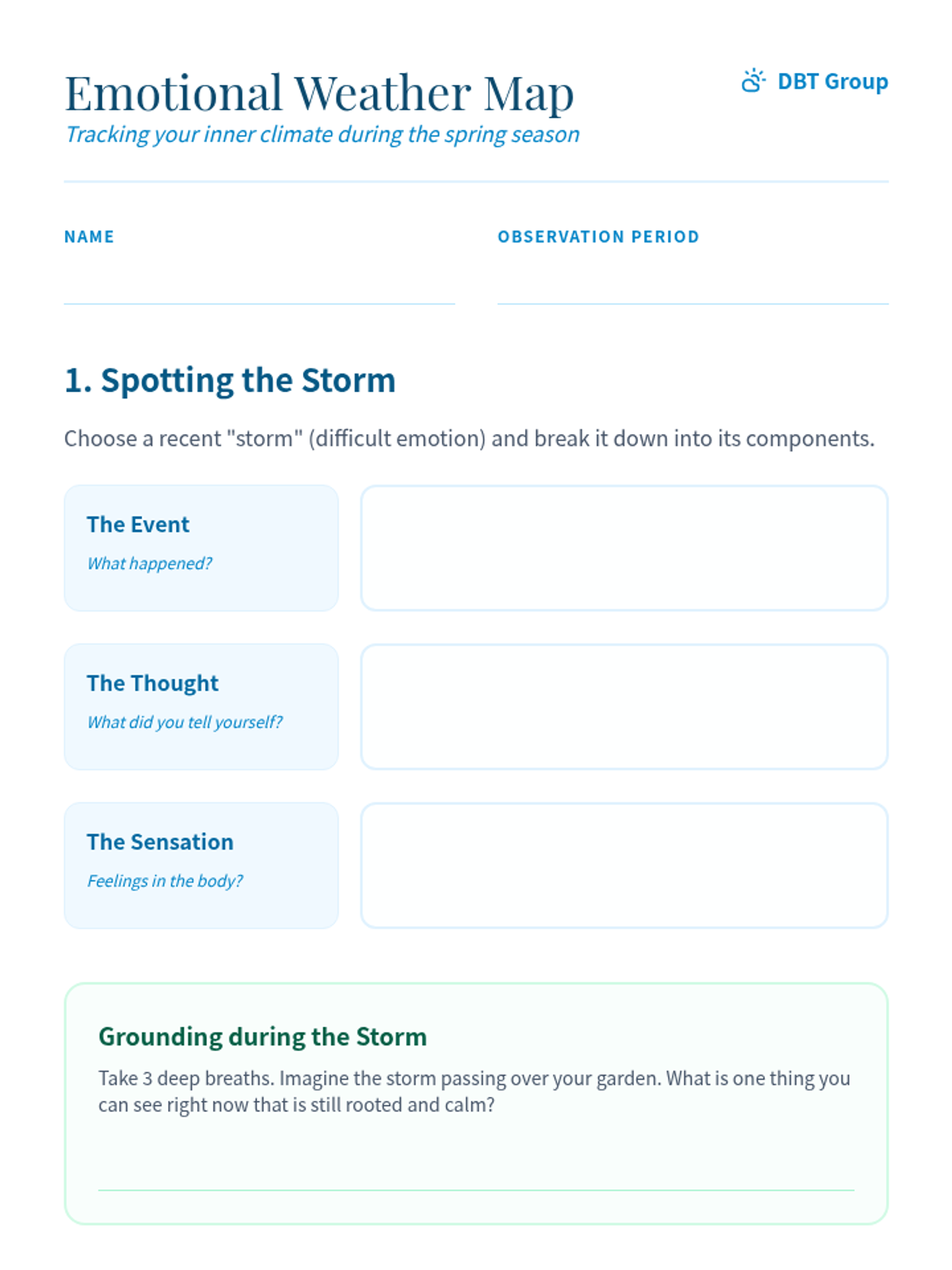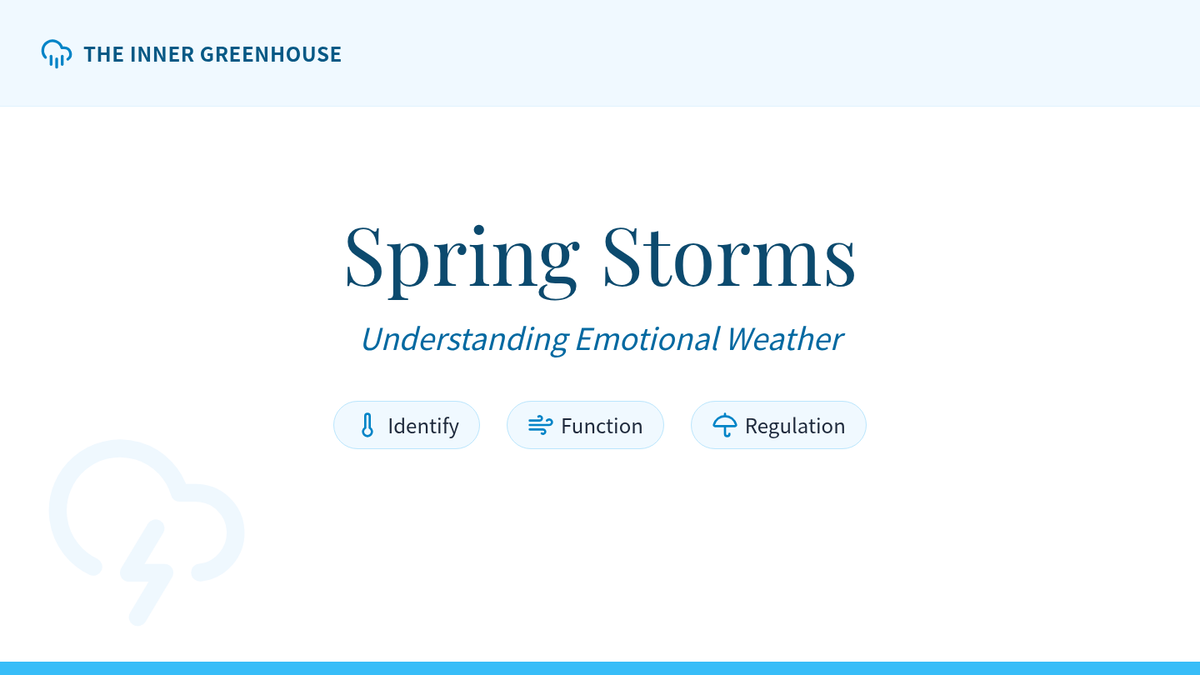 Emotion regulation slides for adults in a DBT group. Uses the metaphor of spring storms to explain how emotions function, their temporary nature, and how to identify the components of an emotional response. Updated to fix scaling and blank page issues.