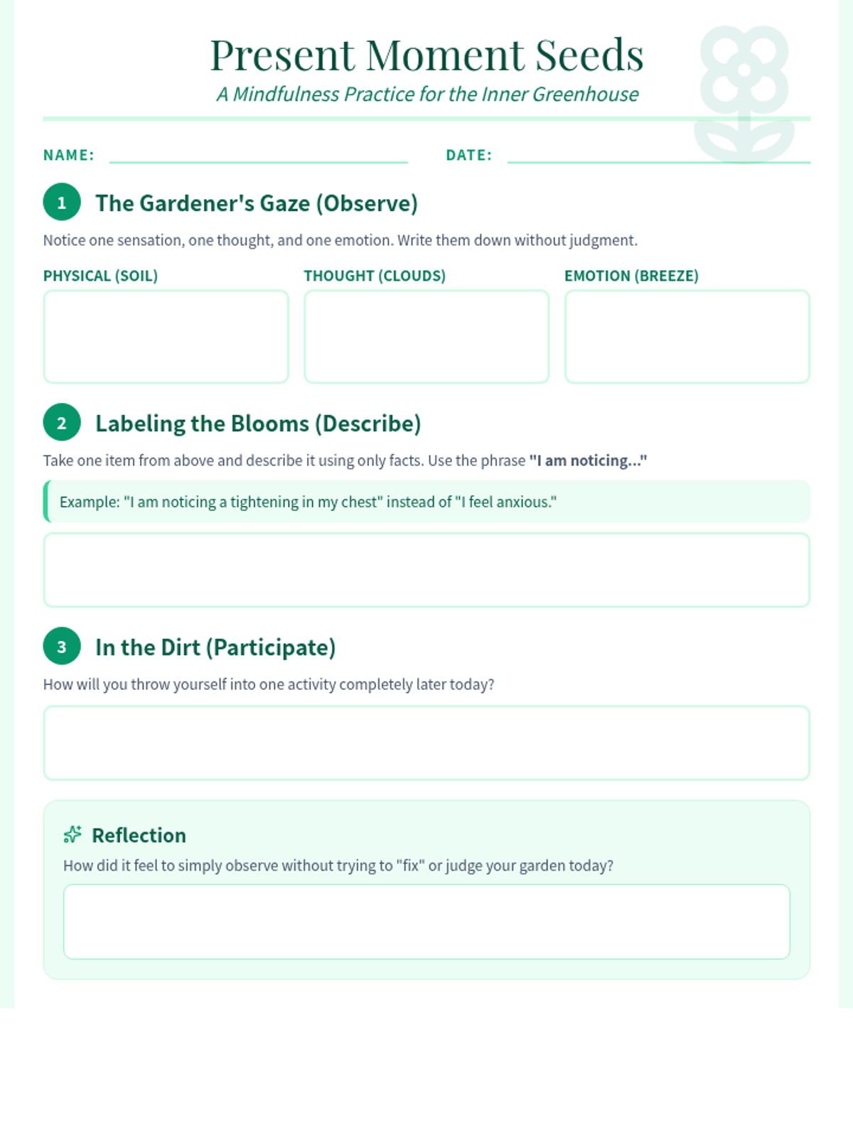 A mindfulness worksheet for adult DBT groups. Features structured sections for practicing the 'Observe' and 'Describe' skills using a spring garden metaphor. Updated to fix layout, page breaks, and contrast issues. Now fits comfortably on a single page.