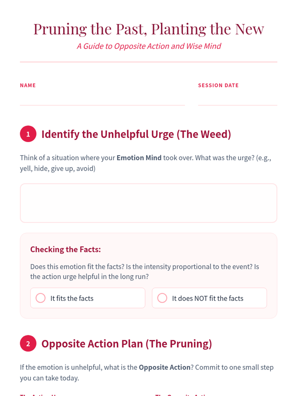 A DBT worksheet for adults focusing on Opposite Action and Wise Mind. Updated to fix page breaks, remove markdown artifacts, and maximize work areas.