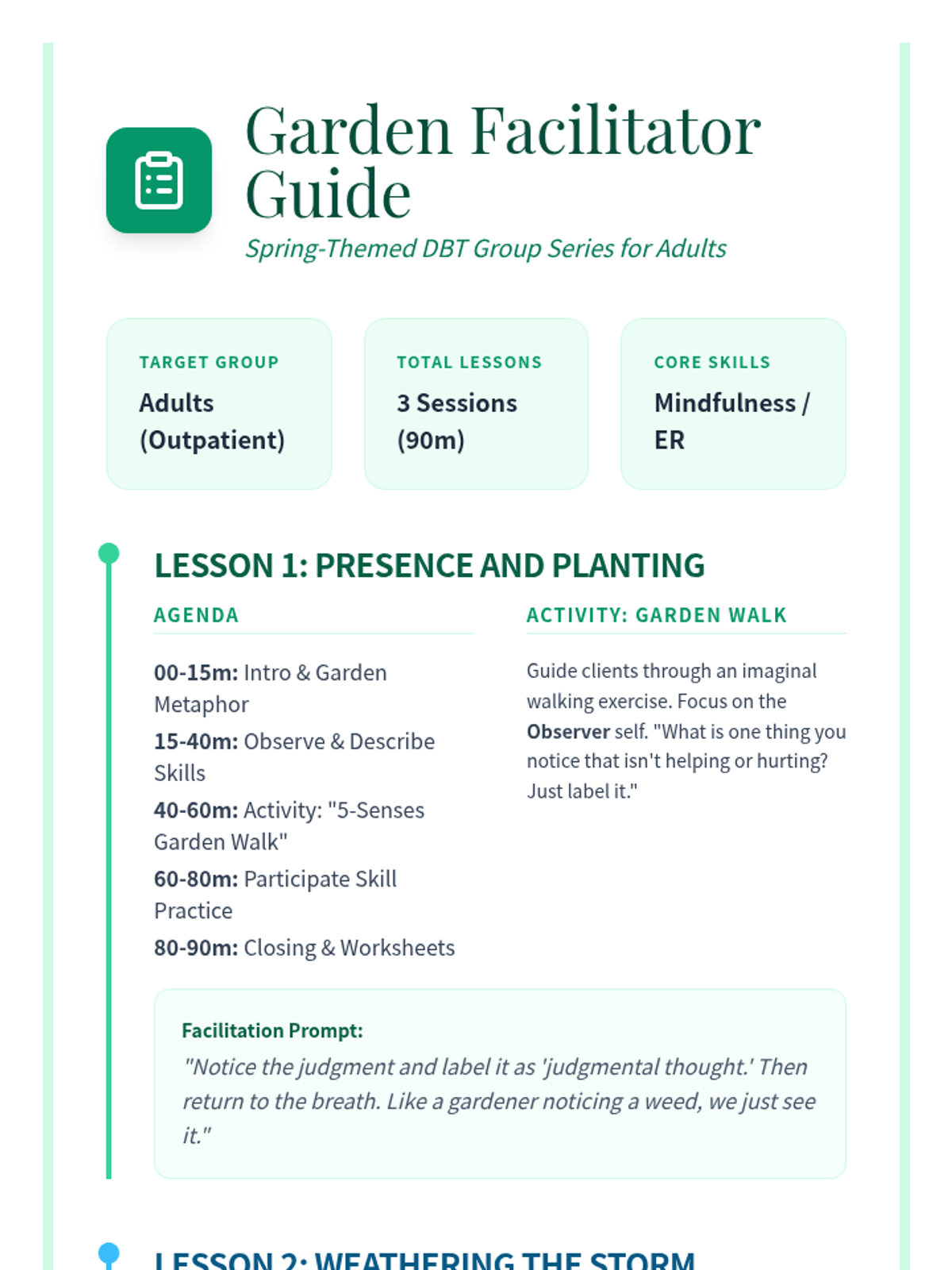 A teacher resource/facilitator guide for the spring-themed DBT group sequence. Provides lesson objectives, facilitation tips, discussion prompts, and key metaphors for each of the three sessions. Updated to fix layout, page breaks, and content depth.