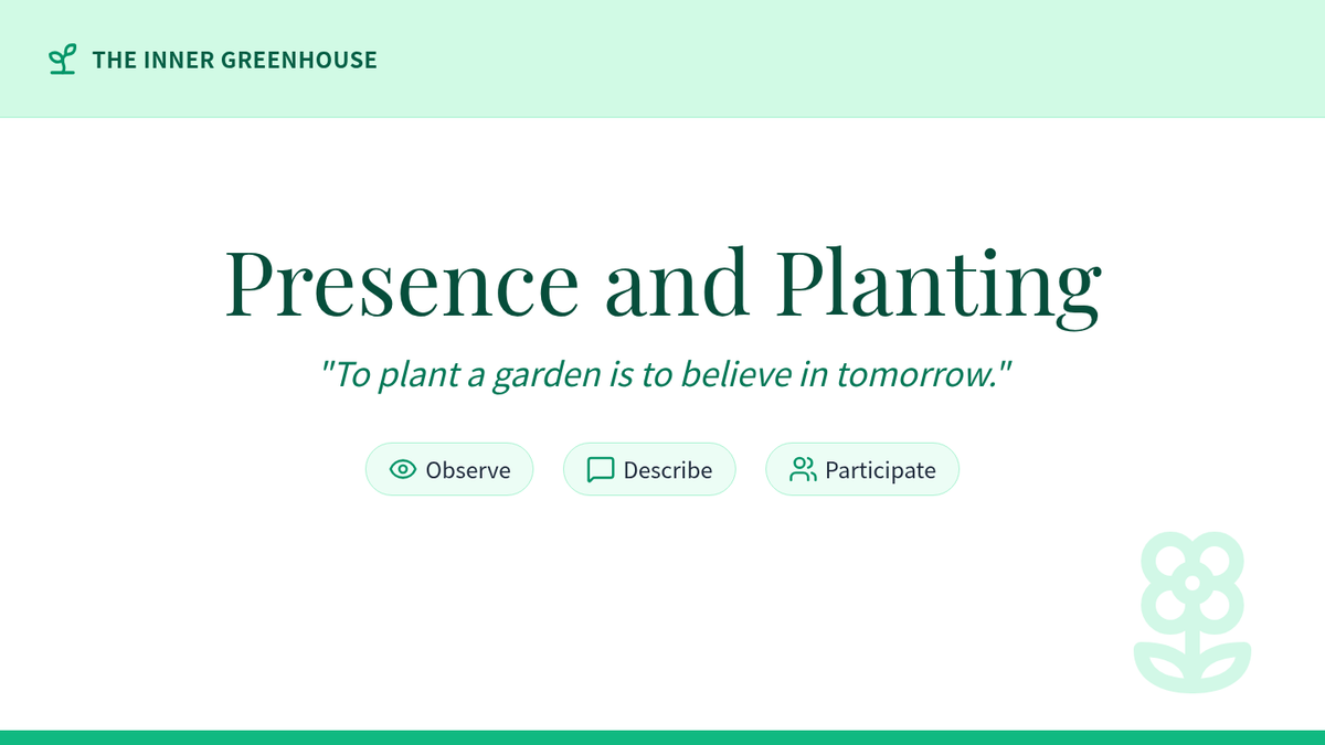 Introduction slides for a DBT mindfulness session for adults. Uses a spring greenhouse theme to explain the core concepts of Observing, Describing, and Participating without judgment. Updated to include the Participate skill and fixed layout issues.