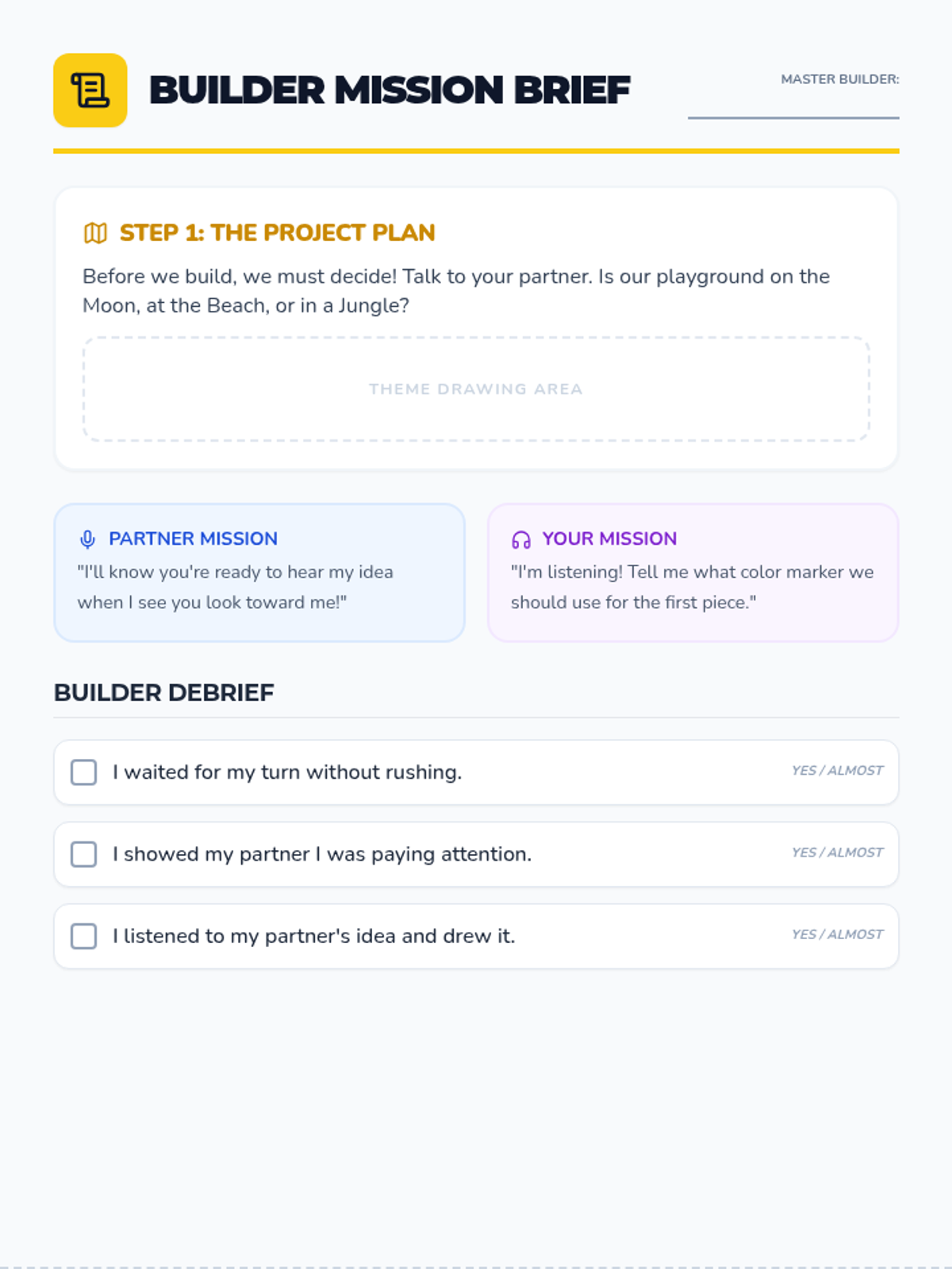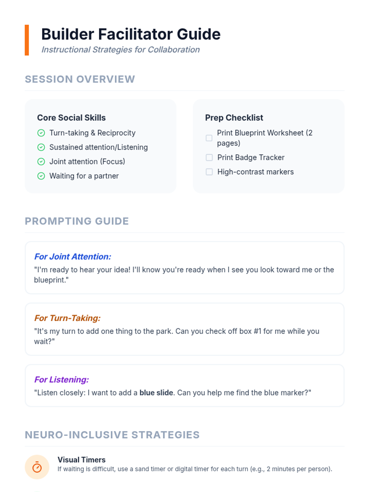 A teacher-facing guide with prompting scripts, strategies for autistic learners, and a session observation log for the Master Builders activity.