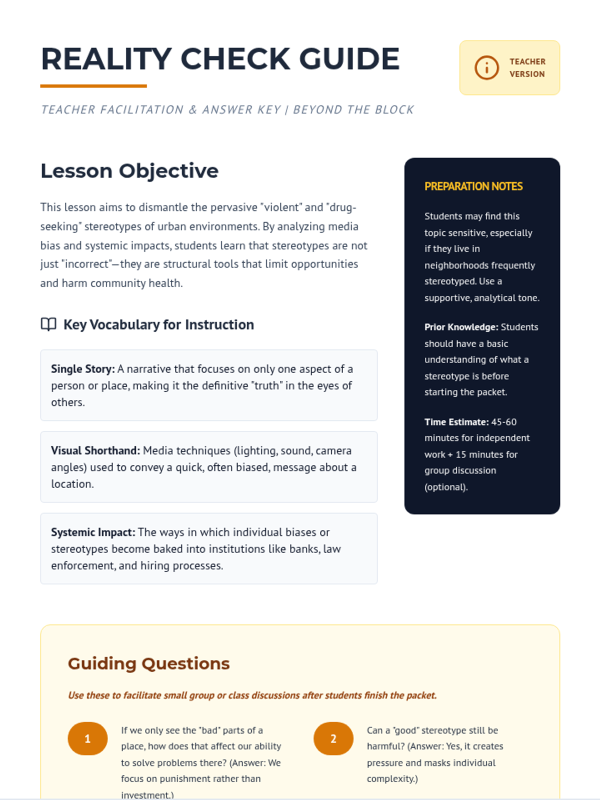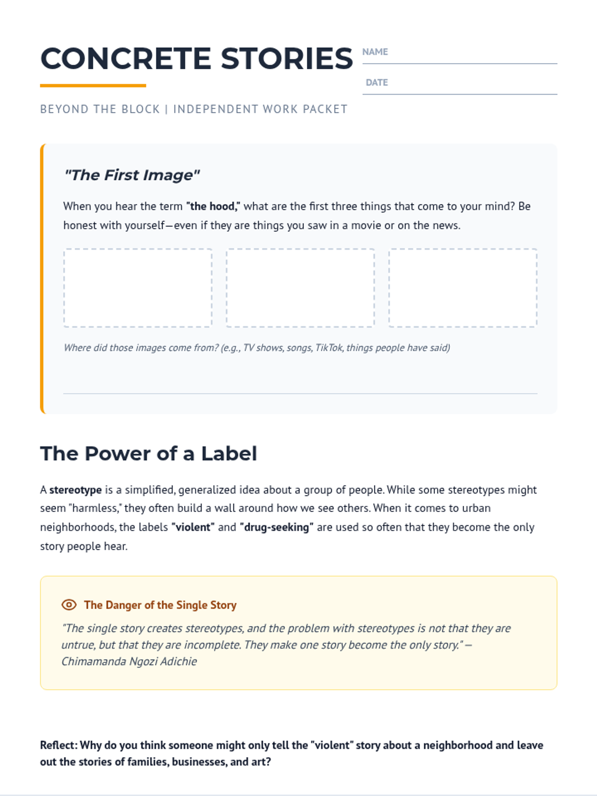 A 4-page student work packet designed for independent study. It guides students through identifying stereotypes, analyzing media bias, understanding systemic harm, and practice reframing narratives about urban communities.