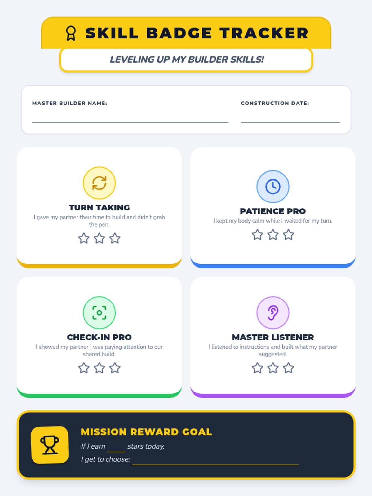 A reward and tracking sheet for social skills, designed to provide positive reinforcement for turn-taking, patience, focused attention, and listening.