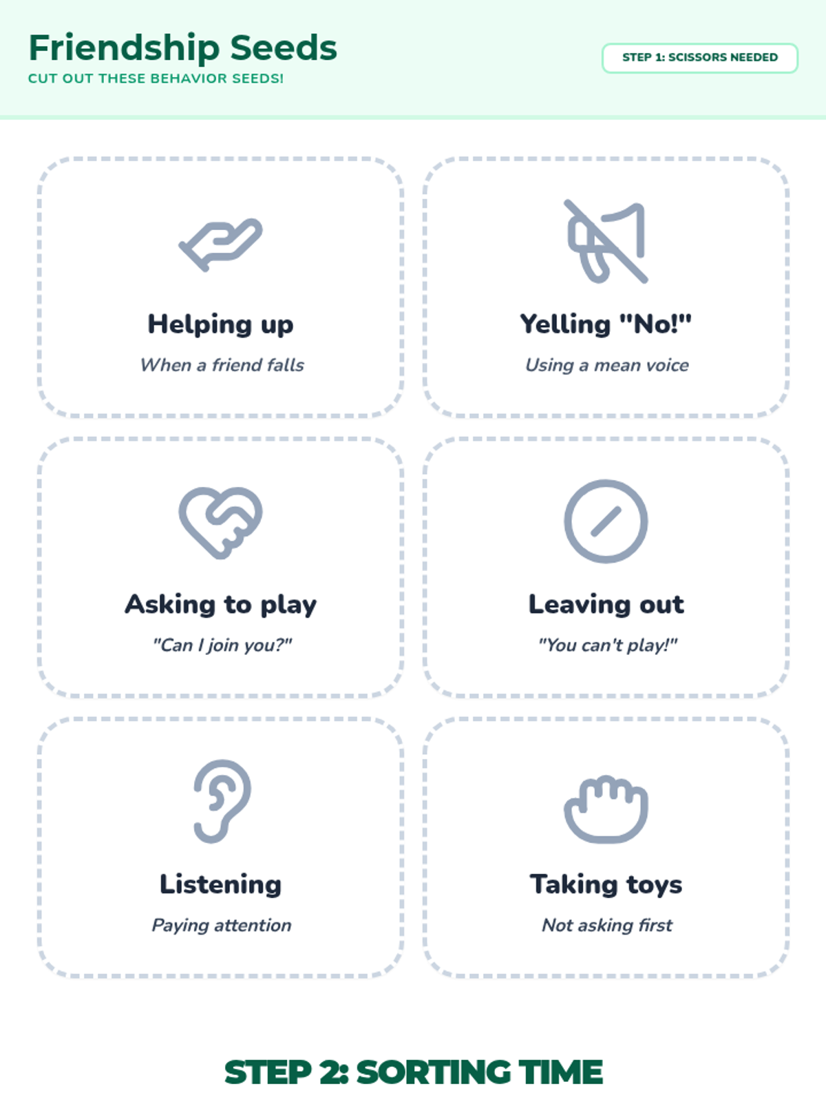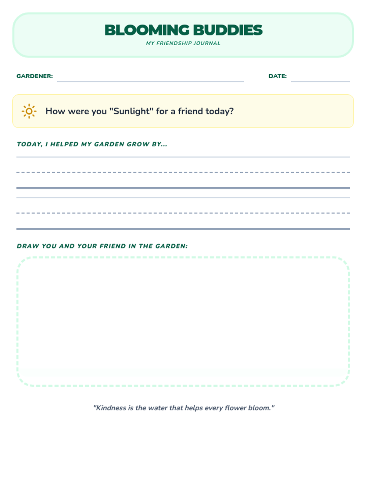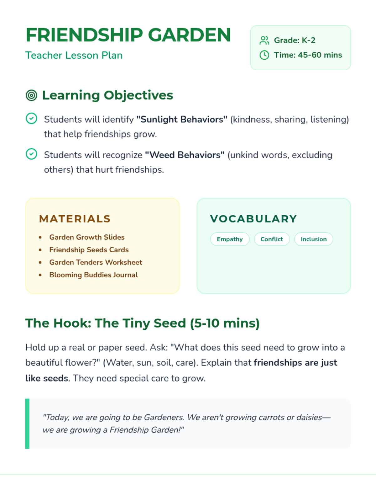 A comprehensive teacher lesson plan for the Friendship Garden lesson, featuring grade-appropriate learning objectives, materials lists, a step-by-step instructional flow, and differentiation strategies for K-2 students. Revised for better page breaks and contrast.
