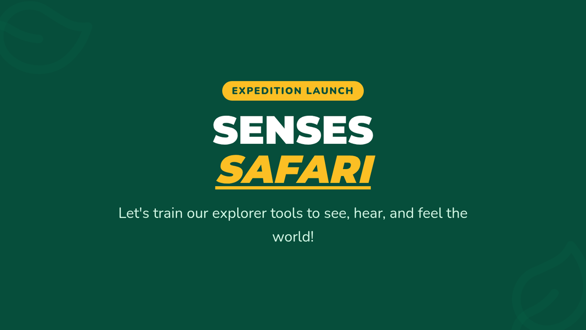 A vibrant, visual slide deck for 1st graders introducing the "senses safari" concept and sensory tools (Eagle Eyes, Elephant Ears, Tiger Paws) for a mindfulness walk.