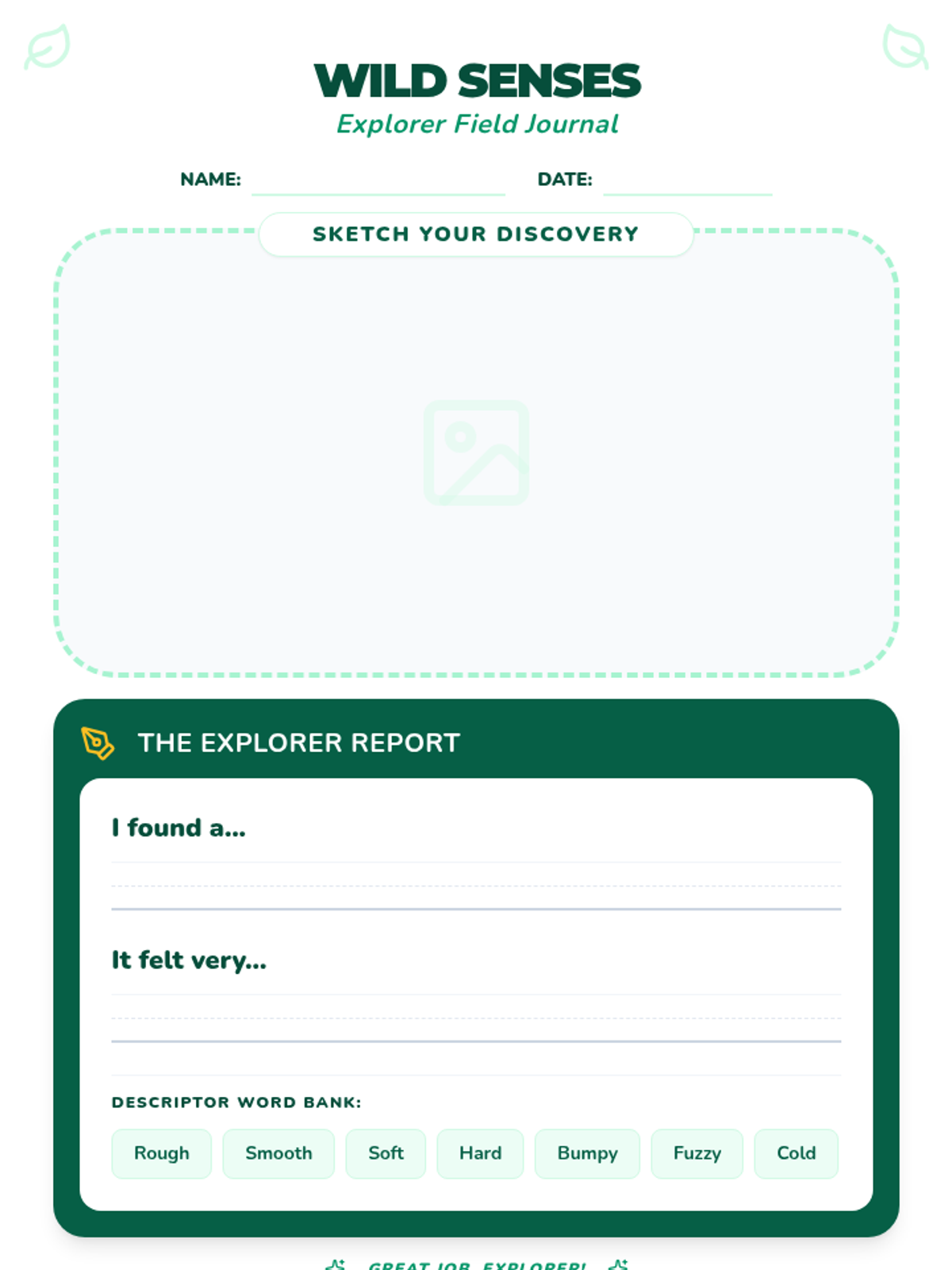 A student-facing journal page for 1st graders to draw and write about their favorite sensory discovery from the Senses Safari. Includes a word bank for descriptors.