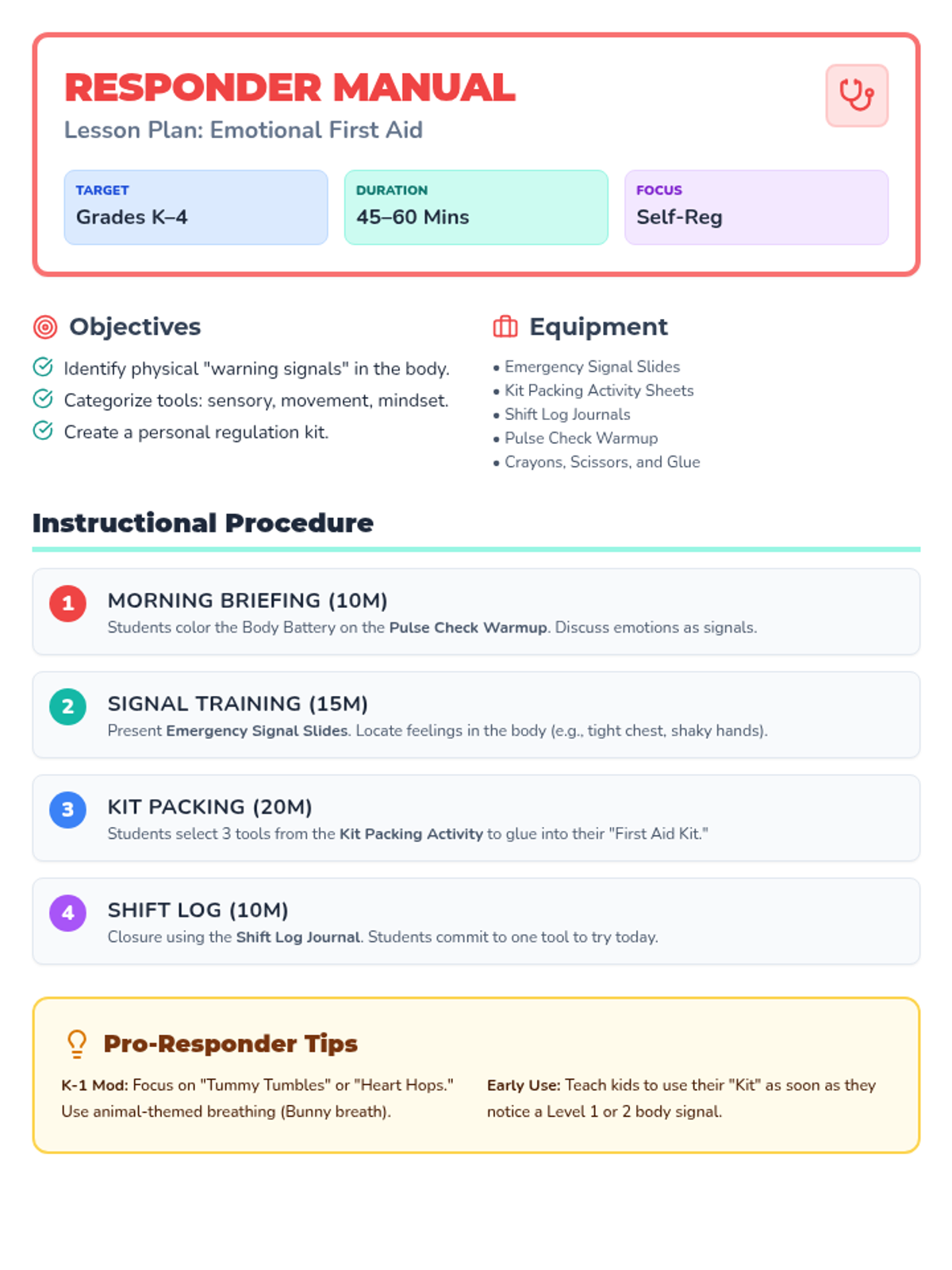 A detailed teacher's guide for the Feeling First Aid lesson, including learning objectives, a material list, step-by-step instructional procedures, and differentiation tips for K-4 students.