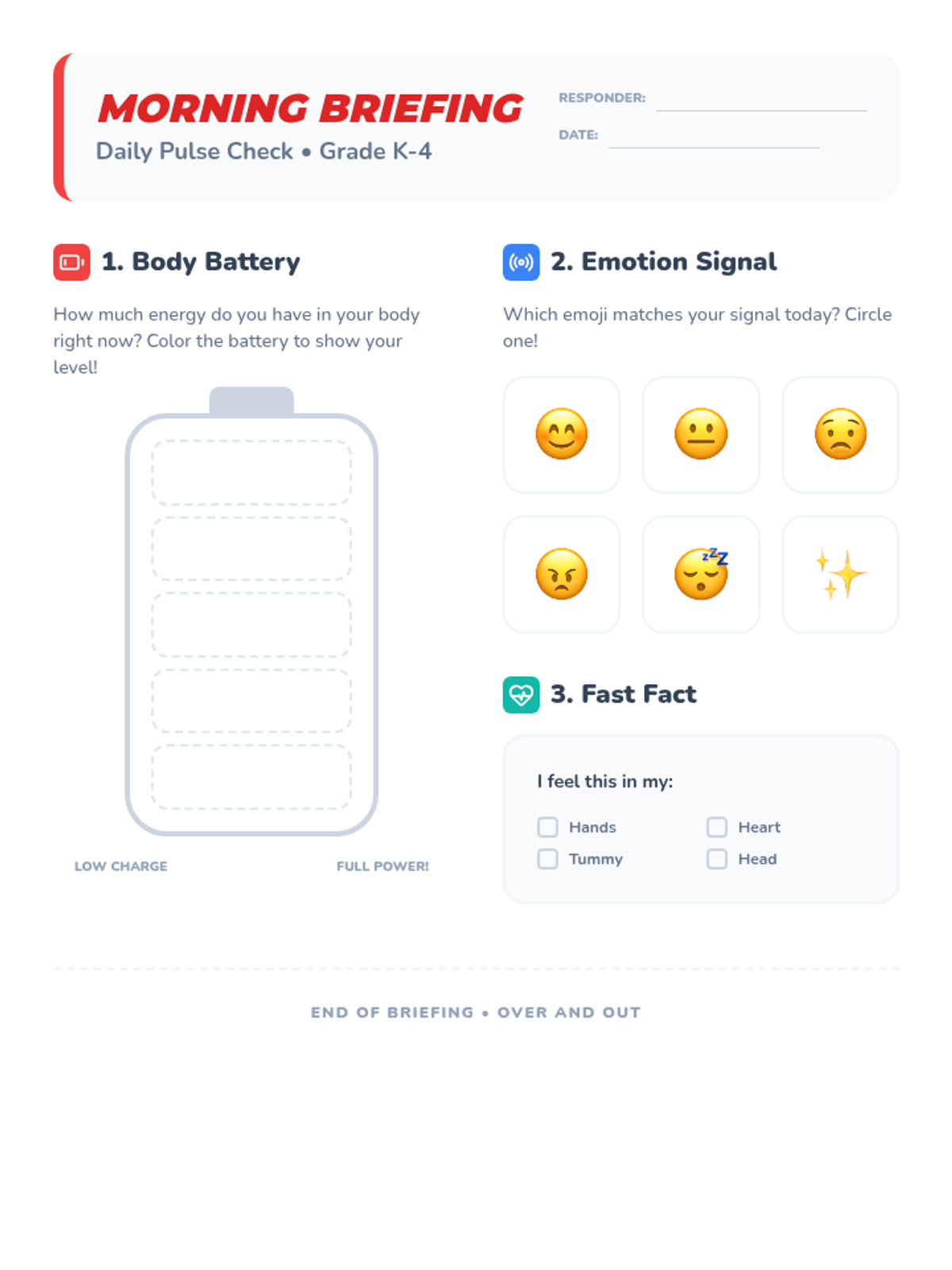 A daily reflection journal for students to track their "battery levels," identify emotions felt during the day, and practice noting physical body signals and the coping tools they used.