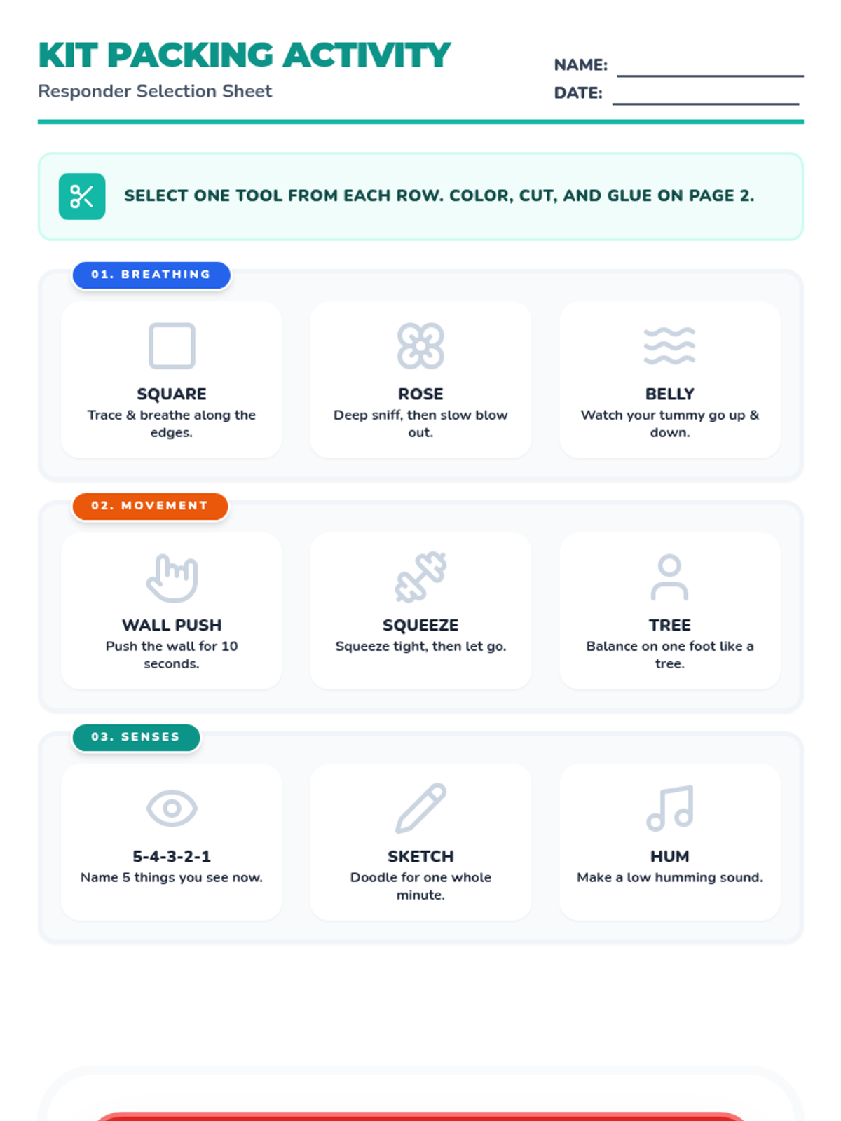 A cut-and-paste activity where students select personalized coping tools from three categories (Breathing, Movement, and Sensory) and assemble their own "Emotional First Aid Kit."