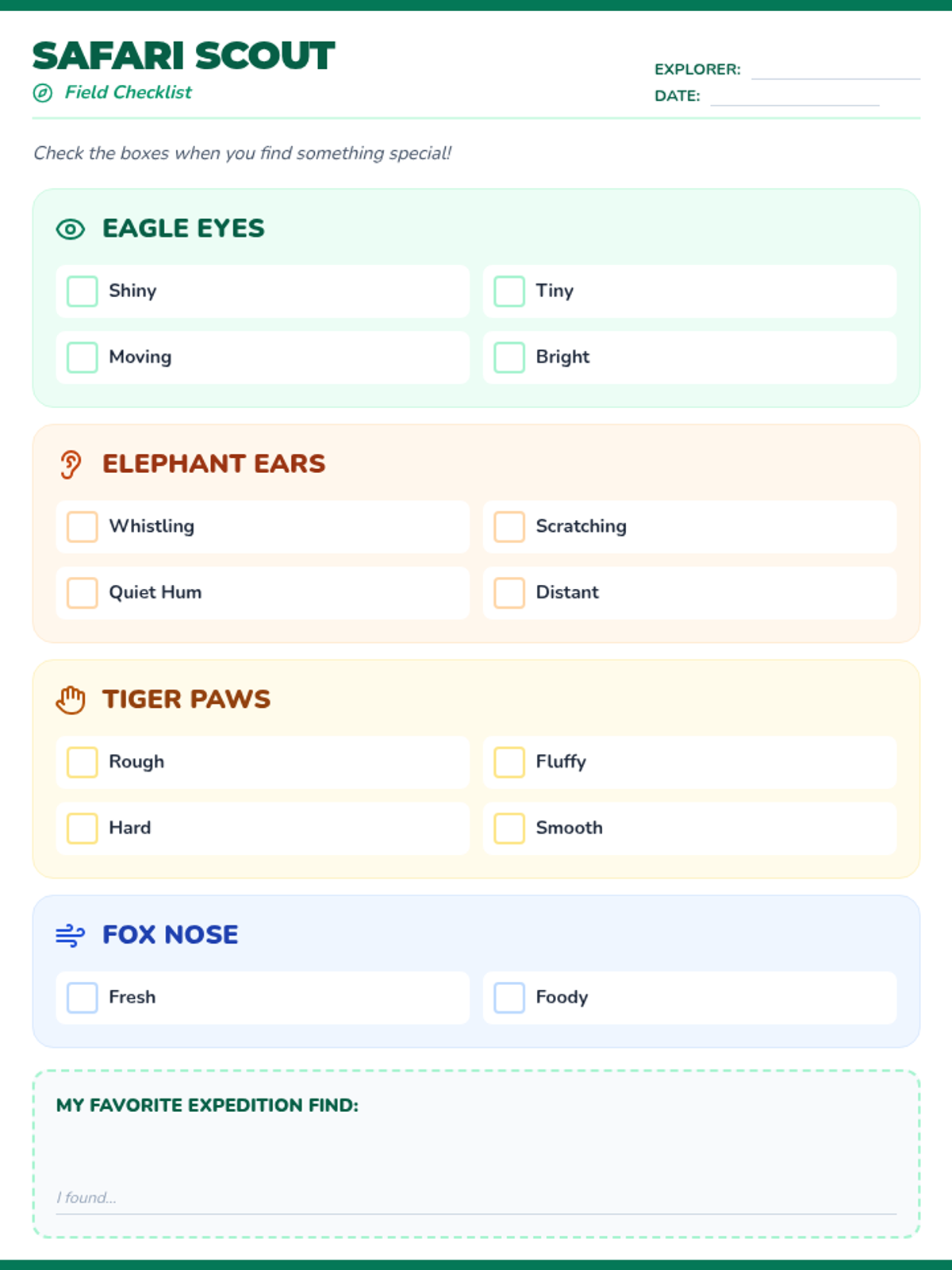 A structured checklist for 1st-grade students to use during their sensory safari walk, featuring icons and descriptive categories for sight, sound, and touch.