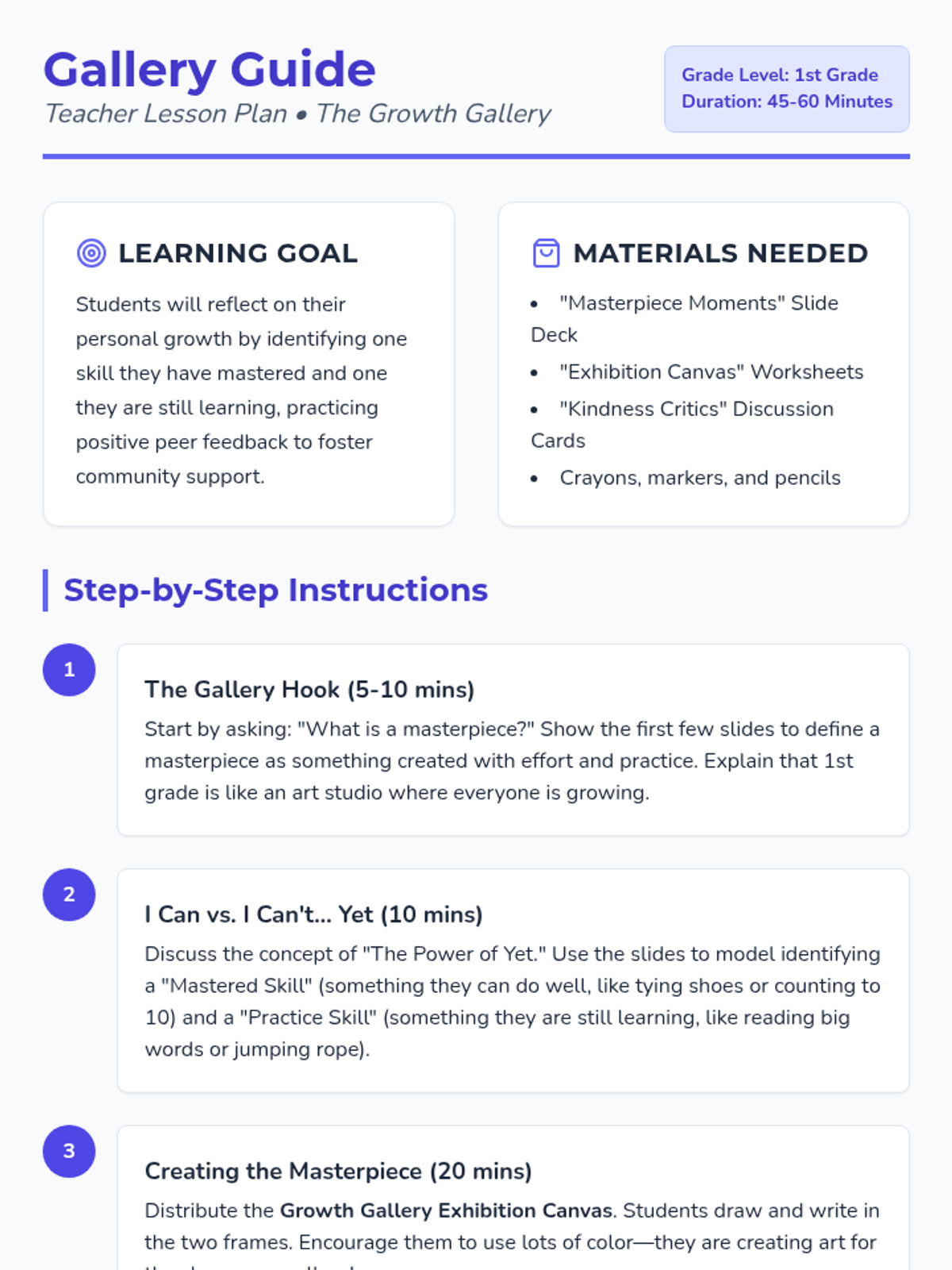 A comprehensive teacher guide for The Growth Gallery lesson, including objectives, step-by-step procedures, and differentiation strategies. Revised for better page flow and legibility.