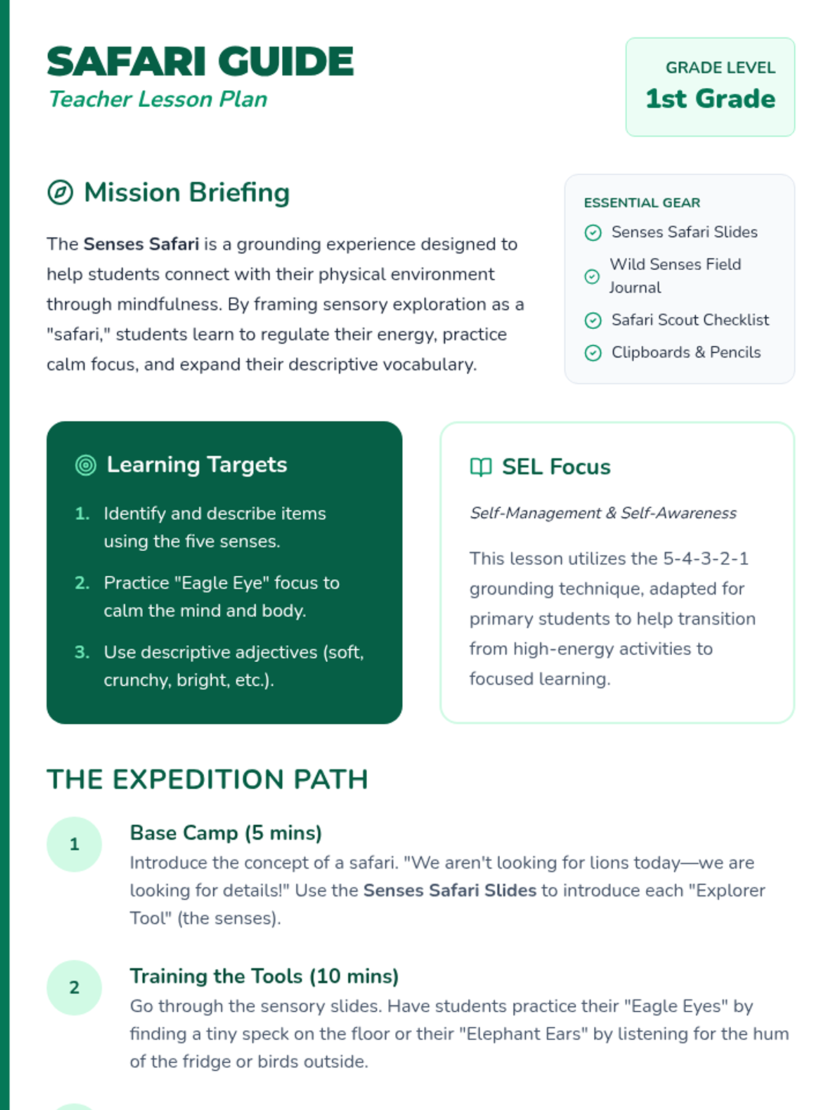 A comprehensive teacher guide for the Senses Safari lesson, outlining objectives, materials, and a step-by-step instructional path for 1st grade mindfulness.