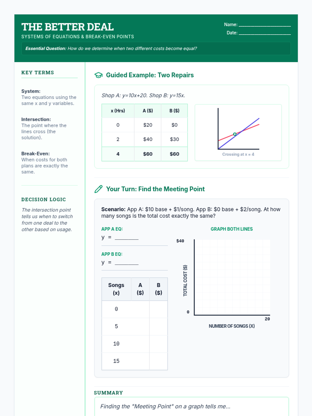 A Cornell-style notebook page that teaches students how to compare two different consumer options using systems of equations. It guides them through writing two equations, completing a comparison table, and graphing both lines on one coordinate plane to find the break-even point.