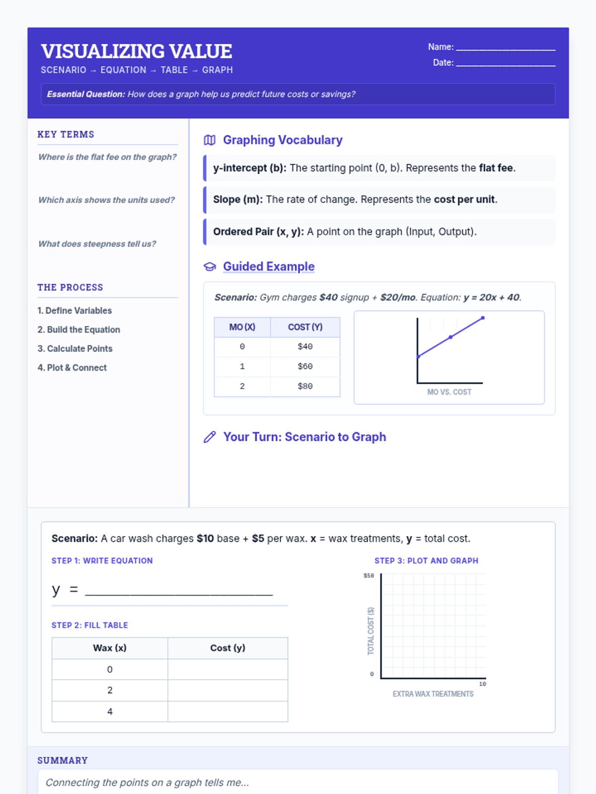 A Cornell-style notebook page that guides students through the complete process of algebraic modeling in consumer contexts: translating a scenario into an equation, completing a table of values, and plotting the data on a coordinate plane. It features a gym membership guided example and a car wash practice problem.