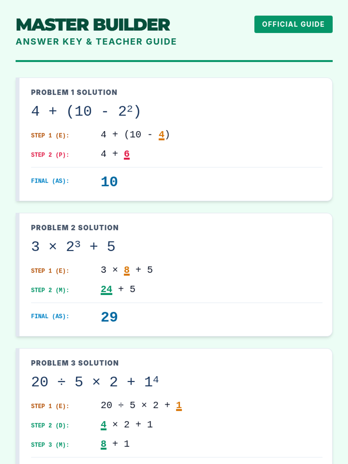 An answer key for the Master Builder worksheet, including step-by-step solutions and instructional tips for implementing the color-coded strategy in an SDI setting. Fixed exponent rendering and page breaks. Final logic check completed.