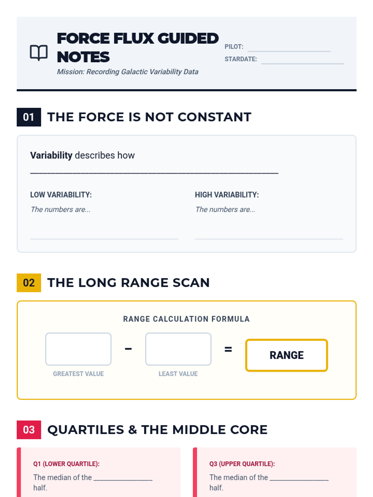A guided note-taking template designed to accompany the Force Flux slides. Includes scaffolded sections for defining variability, recording formulas, and following along with the Grogu practice problem. Revised for handwriting legibility and proper page breaks.