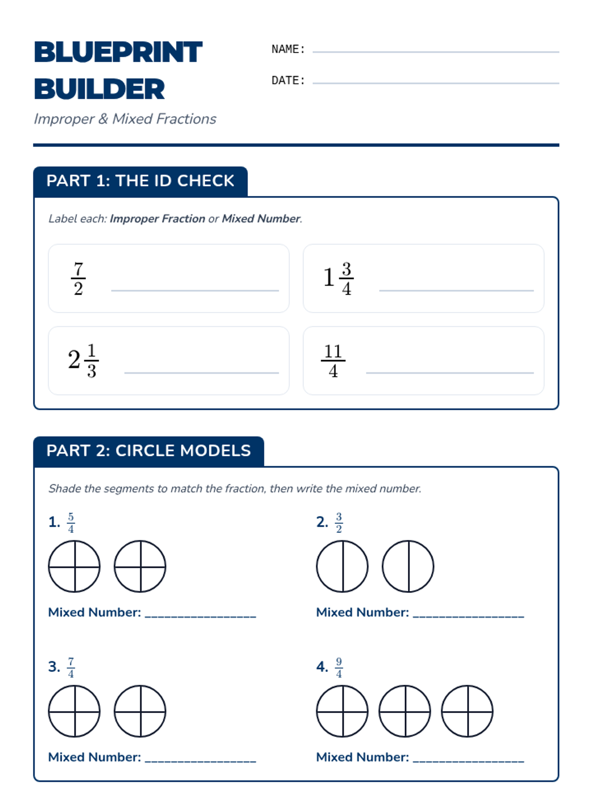 A printable worksheet for students to practice identifying and converting improper fractions to mixed numbers using circle and rectangle area models.